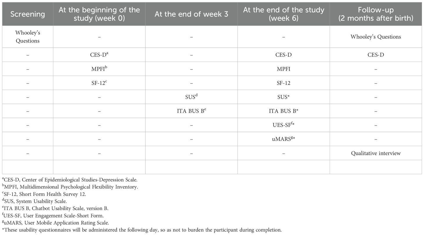 The primary outcomes are UX and UE. They will be assessed via questionnaires, namely the User Engagement Scale Short-form (UES-SF) (28), the System Usability Scale (SUS) (29), the Italian version of the Chatbot Usability Scale (ITA BUS B) (30), and the User Mobile Application Rating Scale (uMARS) (31), which will be administered at different time slots through the study, in particular the usability questionnaires will be administered at the end of the third (3 questionnaires) and sixth (end of the study; 4 questionnaires) weeks.