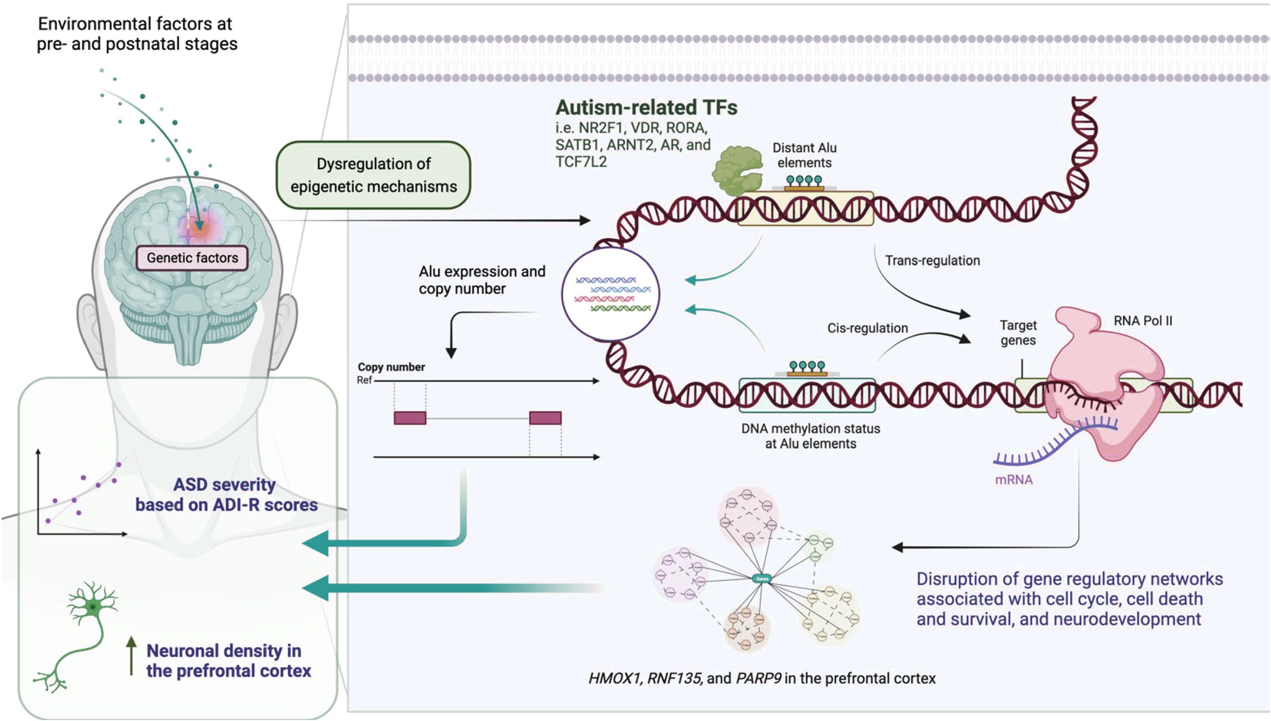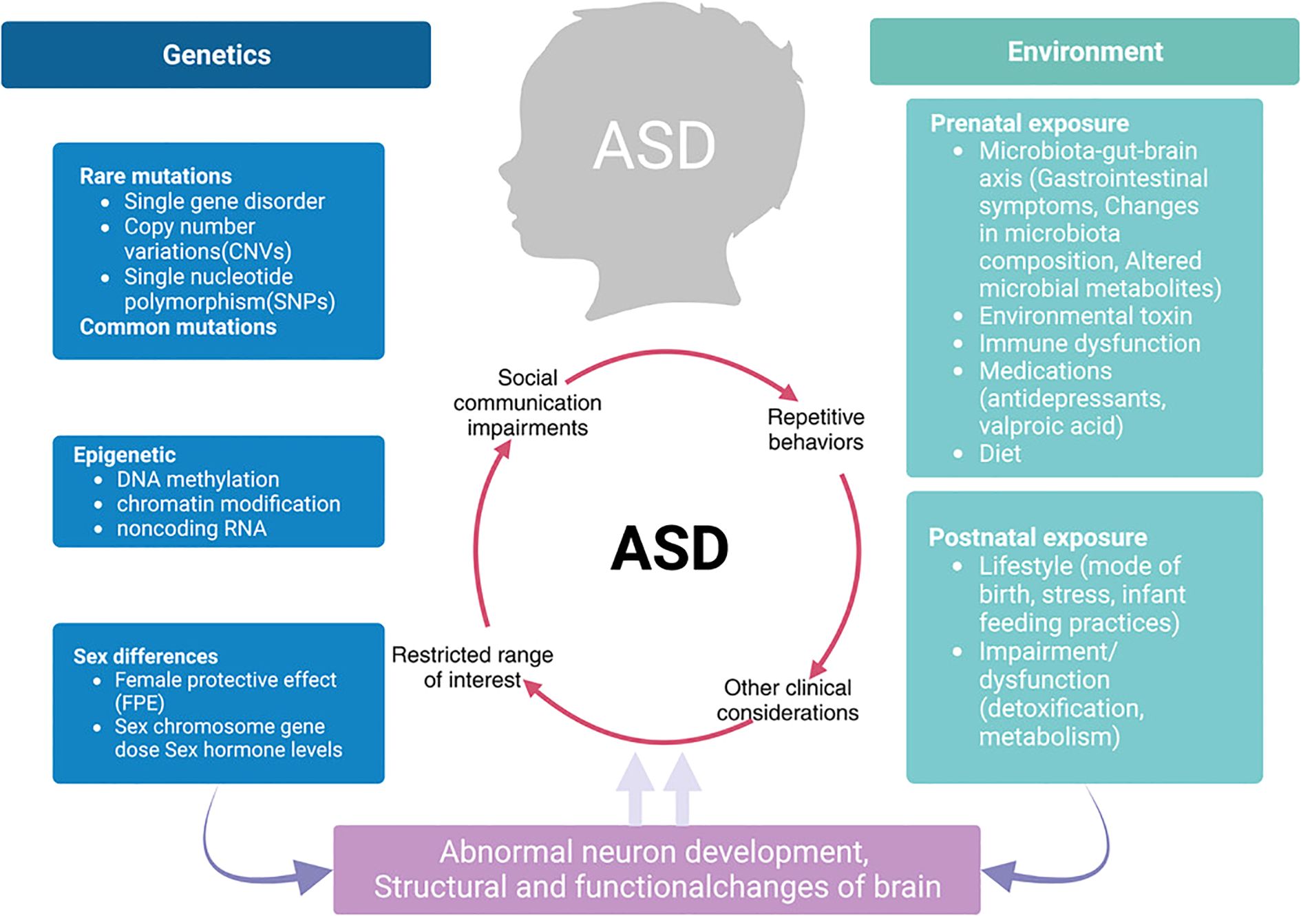 Figure 1. Integrated model of ASD pathophysiology linking genetics, environment, and neurodevelopmental outcomes.