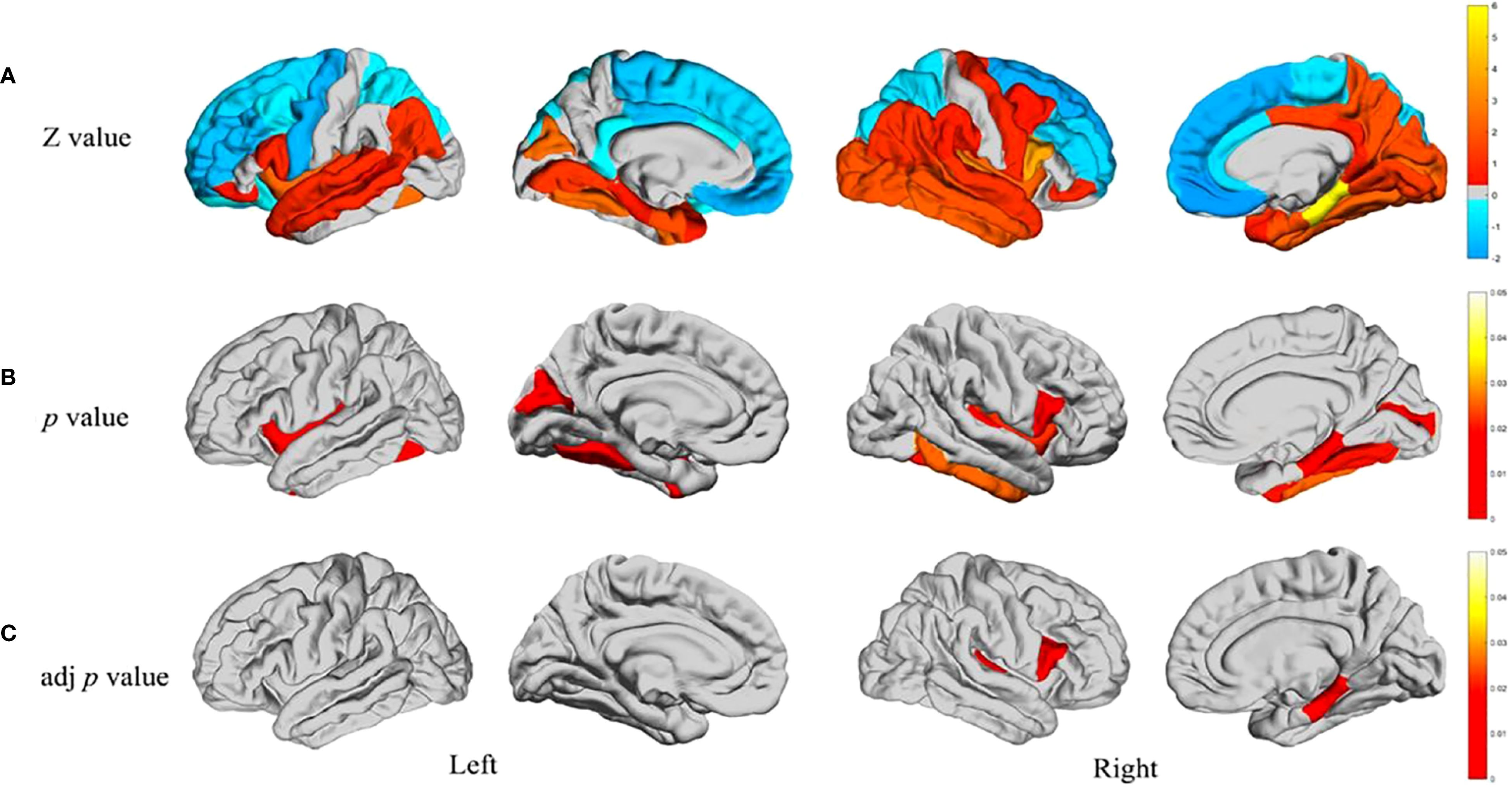 Figure 2. Developmental trajectory of structural brain abnormalities in ASD (A) Differences between individual groups regarding the structural covariance between the cerebellum and 34 other brain regions in each separate hemisphere. Warm colours in the Z-test results are reflective of having greater covariance versus the rest of the ASD sample who are shown by cool colours where covariance was low. As a result, these Z-values are reflective through the colour bar wherein Z-values calculated through Z-test are represented. (B) Areas of the brain characterised by significant intergroup differences in structural covariance (p < 0.05). (C) Intergroup differences in p values controlled for FDR (p < 0.05). Novel techniques of neuroimaging have also shown remarkable changes in the subcortical regions and the organisation of white matter. Diffusion radiomics approaches have documented specific patterns of white matter organisation in children with ASD, which help to shed light on differences in structural connectivity (23). These discoveries are crucial for the further investigation of how changes in structural connectivity may underlie the behavioural and cognitive features associated with ASD. Treatment effectiveness provided these structural MRI studies of the brain manifests some features that appear stable across different cultures and ages, but the features of alteration of the brain seen in ASD (3) are highly diverse. These neuroimaging findings have further clinical value which is corroborated by research on the MRI diagnosis of brain ASD in children (24). The cerebellum is a critical structure in the pathophysiology of ASD and has an abnormal structure and function and multitude of other studies. Specific disruptions in cerebellar ASD specific patterns which have been found van der Heijden et al. (25) suggest controversy regarding both motor and cognitive deficits. In social cognition and emotion Mapelli et al. (26) suggest that the cerebellum is involved much more than motor control. The focus of more recent work is on cognitive emotion and its implications on ASD as a whole behavioural phenotype Rudolph et al. (27). The aforementioned abnormalities at the cellular level are accompanied by structurally abnormal ASD neuronal and glial cell population. Rudolph et al. (27) notes the existence of both grey matter microstructure and white matter microstructure for ASD pathology and advances in molecular imaging clearly describe changes. Matuleviciute et al. (28) have recently highlighted changes in microglial cells; initiatives treating autism from a neurodevelopmental angle amplifying the capsule of microglial cells in regard to ASD. Understanding of biological origins that underlay the structural changes that have been observed can be achieved via these findings.