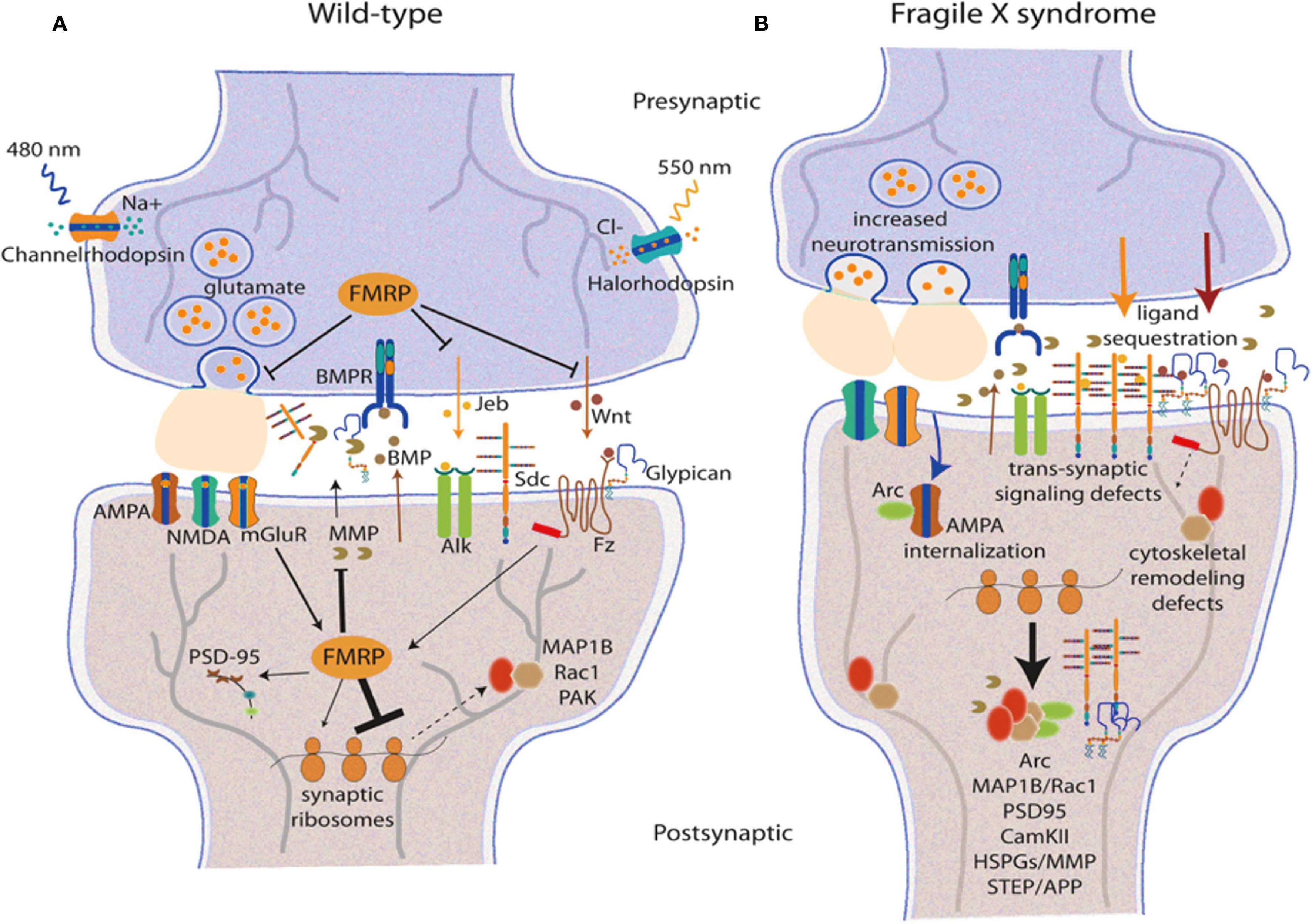 Figure 3. Synaptic processes and circuit organization in typical and pathological conditions. (A) depicts the synaptic structure of wild type, showing the presence of glutamatergic neurotransmission which includes FMRP, AMPA, and other synaptic signalling elements. (B) depicts synaptic pathology that is characterised by increased neurotransmission, translocated receptors, impaired receptor trafficking, and trans-synaptic signalling which is typical in many neurodevelopmental disorders. The connectivity of the prefrontal cortex is fundamental to the symptoms presented in ASD. There have been severe changes in the prefrontal functional connectivities, especially those involving the glutamatergic signalling systems and synaptic interactions (30). The more pronounced areas are the posterior cingulate cortex where, in resting state, abnormalities are constantly observed due to receptor and synaptic remapping (31). The neurogenetics of altered functional connectivity have shown subtypes of ASD to have certain distinct patterns of synaptic protein abnormalities (6). Subcortical circuit impairment of function, including that in the corticostriatal pathway, has become one of the hallmarks of ASD. Certain types of synaptic dysfunction, such as AMPA receptor trafficking and postsynaptic density (PSD) alterations, have been identified within the CTX-striatal synaptic pathways (32). These changes are associated with altered resting-state dynamics believed to be causatively linked to social deficits in ASD (33). Another study focused on brain entropy has opened the door to further understanding of how synaptic disruptions translate into neural dynamical features, calling “unrest while resting” a distinctive sign of ASD brain function (34).