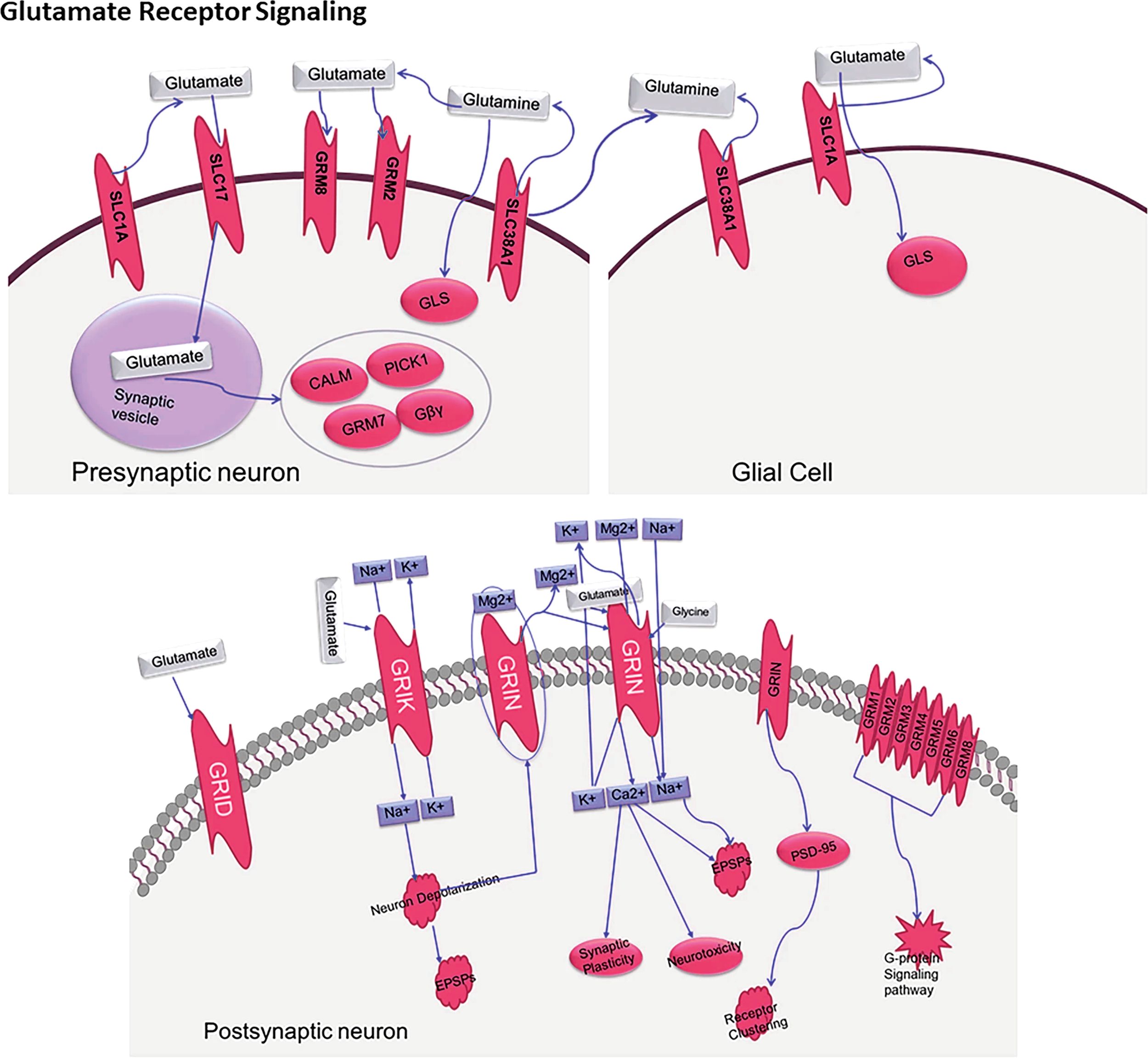 Figure 4. The biological processes behind glutamate neurotransmission involving key presynaptic neurons, glial cells, and postsynaptic neurons, as well as important transporters (SLC1A, SLC17A), receptors (GRIN, GRIA, GRIK), and receptors are illustrated through a molecular Glutamate Receptor sign an “SLC1A_2. SLC17A_8_Grin1_Gria1_GriK2_2_Hg Cosmc8”.