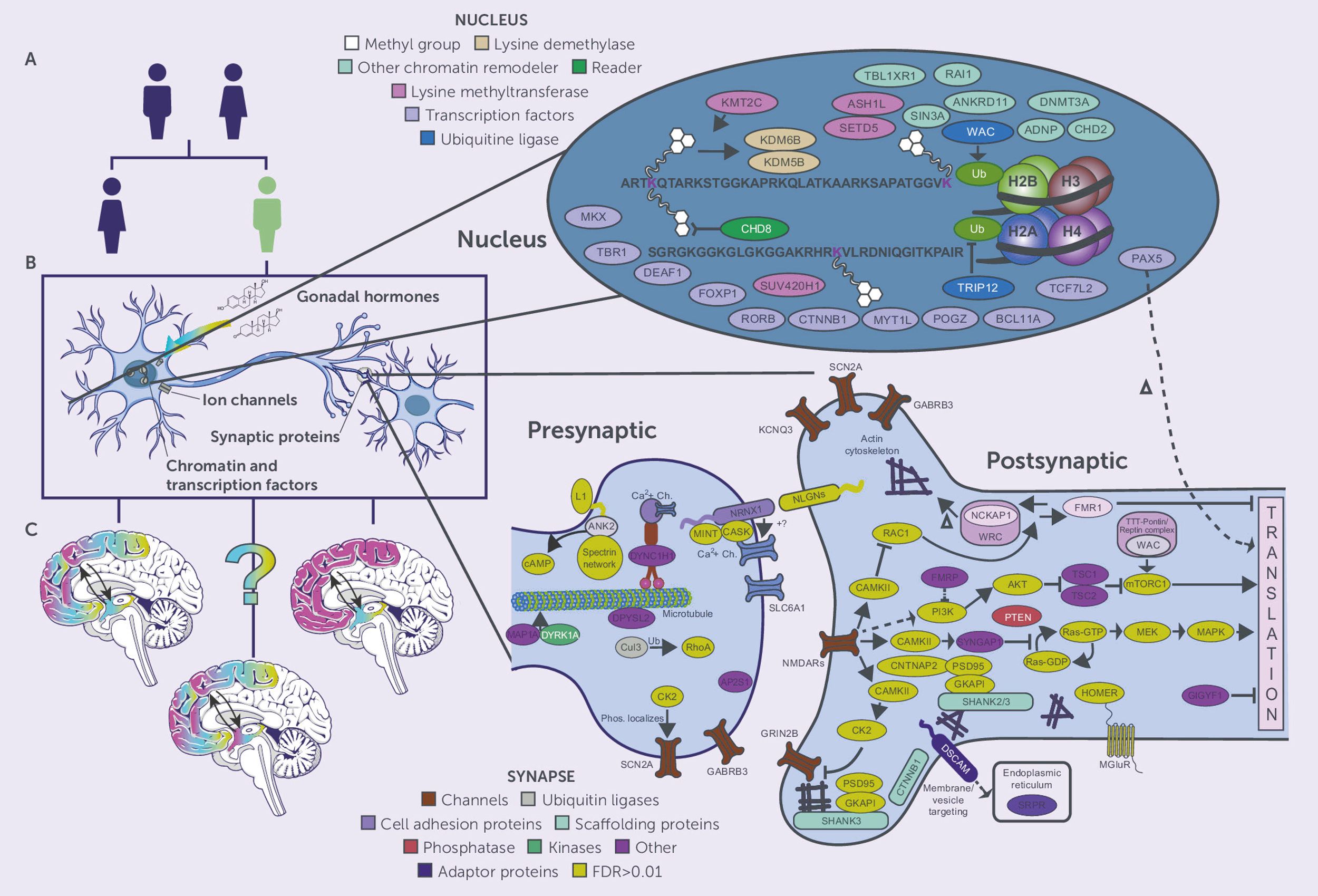 Figure 5. Molecular mechanisms and genetic pathways in ASD. Three parts are presented: (A) Sex differential genetic risk factors for ASD, (B) Cellular components of ASD-associated genes such as gonadal hormones, ion channels, synaptic proteins, chromatin regulators, and (C) Expression in specific brain regions. The detailed molecular map shows nuclear factors (chromatin remodelers, transcription factors, epigenetics) and synaptic components such as presynaptic and postsynaptic proteins, channels, and signalling cascades involved in the pathogenesis of ASD.