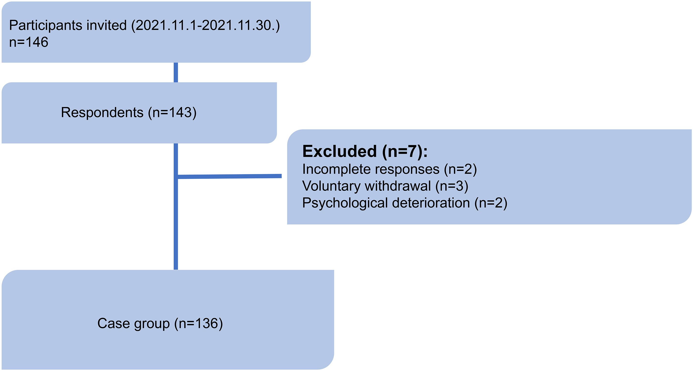 A total of 146 individuals were invited to participate in the study, and 143 responded (response rate: 97.9%). Among these, seven participants were excluded due to incomplete responses (n=2), voluntary withdrawal (n=3) and psychological deterioration (n=2). The final analytical sample consisted of 136 participants. The study flow diagram is presented in Figure 1.