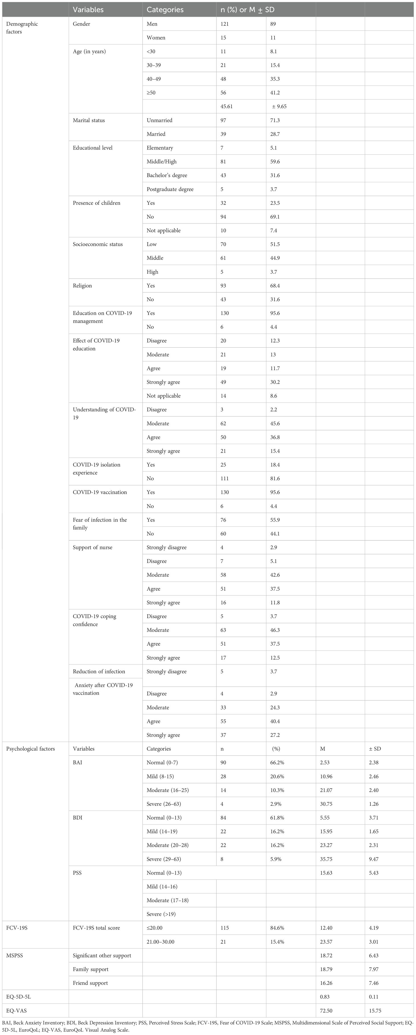 Table 1. Demographic characteristics, mental health, perceived social support, and quality of life (N = 136).