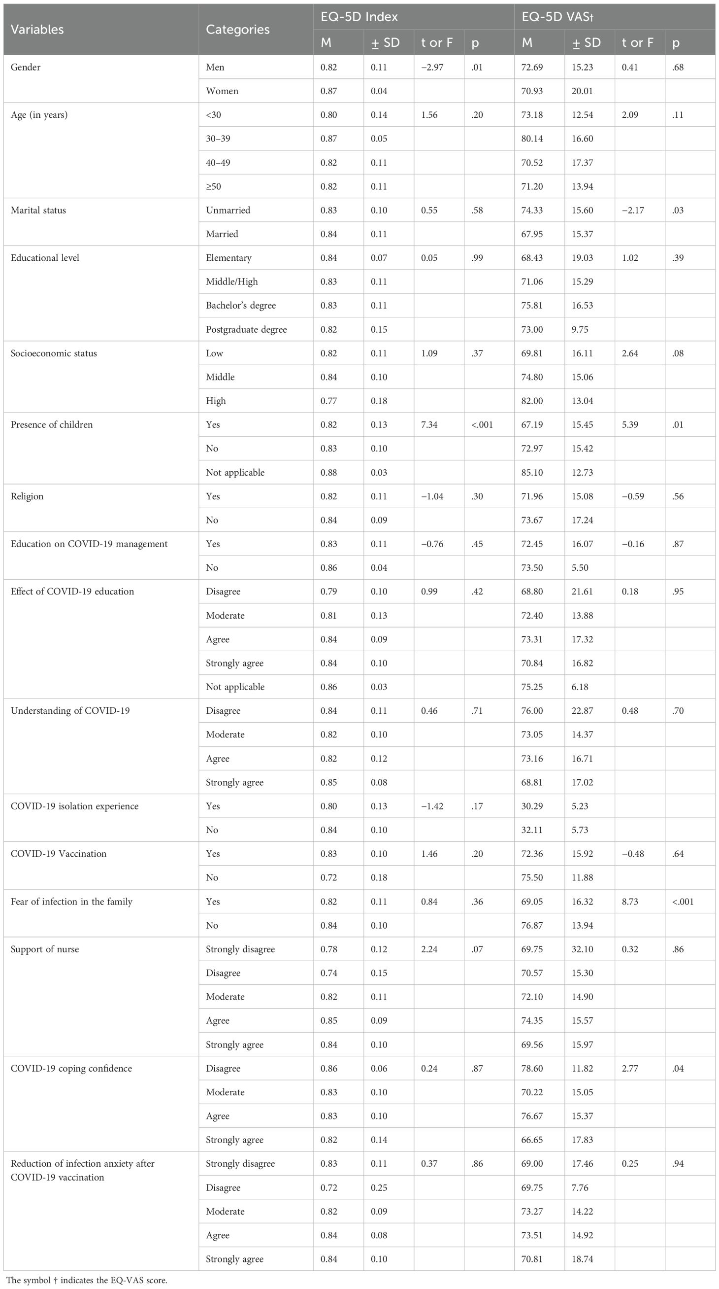 Gender and the presence of children showed statistically significant differences in the relationship between general characteristics and QoL (EQ-5D Index). The QoL was higher among men (t=2.66, p=.012) and among participants with children (t=4.54, p=.018) compared with women and participants without children. Furthermore, significant differences were noted regarding marital status, presence of children, presence of fear of infection from family, and COVID-19 coping confidence in the relationship between general characteristics and the EQ-VAS score. The subjective health state on the day of questionnaire completion was higher among participants who were married (t=−2.17, p=.032), those with children (t=5.39, p=.006), and those who had no fear of infection from family (F = 2.77, p=.044) (Table 2).
