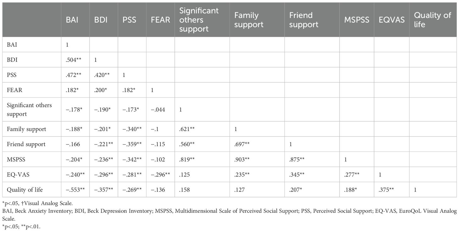 Correlations between depression, anxiety, stress, fear, social support, and QoL