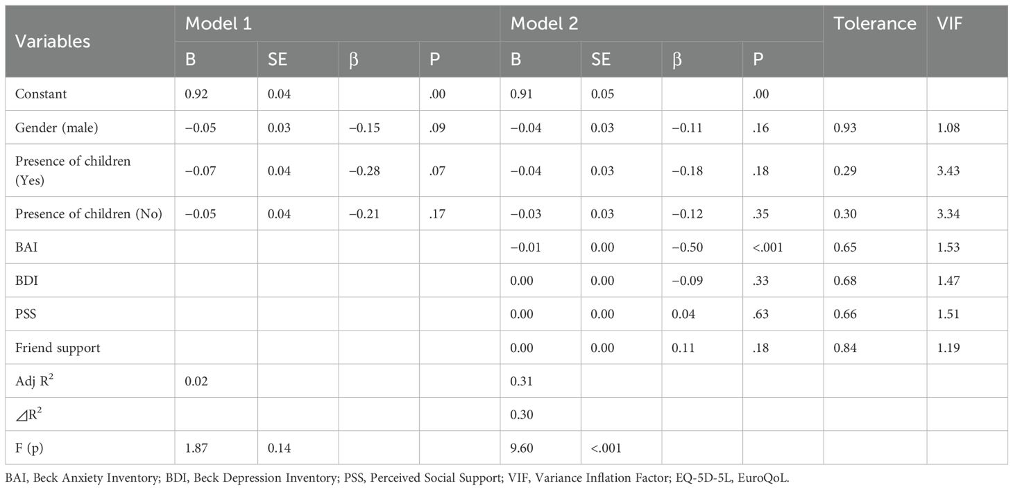 The explanatory power of Model 1 that includes two control variables was 1.9% (F = 1.874, p=.137), with no significant control variables for QoL. Although the individual predictors did not achieve conventional levels of significance, the standardized effect sizes indicate that having children (Yes) may be relatively more influential in predicting lower QoL compared to gender or presence of children (No). These findings provide preliminary insights into the demographic factors influencing QoL among patients with severe mental illness during the COVID-19 pandemic, as measured using the EQ-5D-5L, and underscore the need for further investigation using additional psychological and social support variables. The explanatory power of Model 2 that includes psychological characteristics was 30.8% (F = 9.600, p<.001). In Model 2, anxiety among the control variables was found to affect QoL (β=−0.500, p<.001). Among the predictors, the BAI emerged as the most influential factor, demonstrating a large negative effect on QoL (B = –0.01, SE < 0.01, β = –0.50, p <.001). This finding indicates that a one standard deviation increase in anxiety is associated with a 0.50 standard deviation decrease in EQ-5D-5L scores, underscoring the clinical significance of anxiety in this population. In contrast, demographic variables, such as gender and presence of children, and other psychological variables, including the BDI, PSS, and friend support, contributed minimally to the prediction of QoL. Overall, these results highlight that while the inclusion of demographic and psychosocial variables collectively improves the explanatory power of the model, anxiety—as measured using the BAI—stands out as the most robust and clinically relevant predictor of lower EQ-5D-5L scores. This suggests that interventions aimed at reducing anxiety may have a meaningful impact on improving QoL among patients with severe mental illness during the COVID-19 pandemic.
