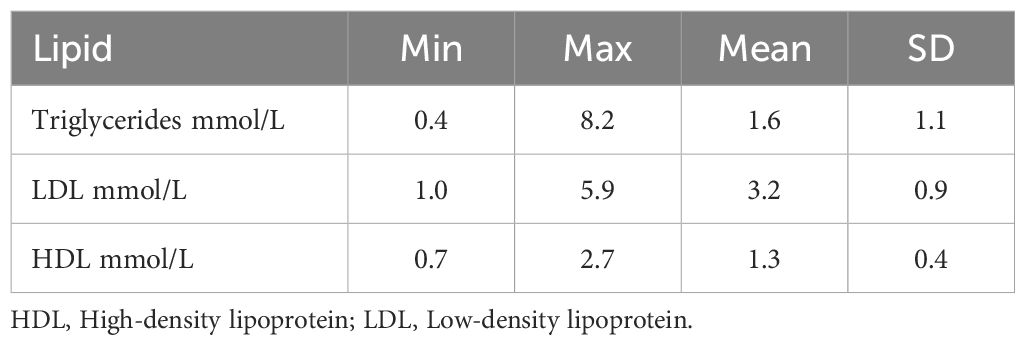 Descriptive statistics of lipids presented in Table 2. The mean TG level was 1.6 mmol/L, SD 1.1, mean LDL level 3.2 mmol/L, SD 1.0, mean HDL level was 1.3 mmol/L, SD 0.4. All mean values were within the reference window used by the laboratory; reference interval TG; 0.5–2.6 mmol/L, LDL 1.2–5.2 mmol/L, HDL 0.8–2.7 mmol/L.