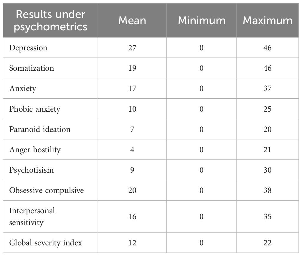 The highest scores were on depression, obsessive-compulsive, somatization, and anxiety symptom clusters in the SCL-90-R (29) (Table 3).