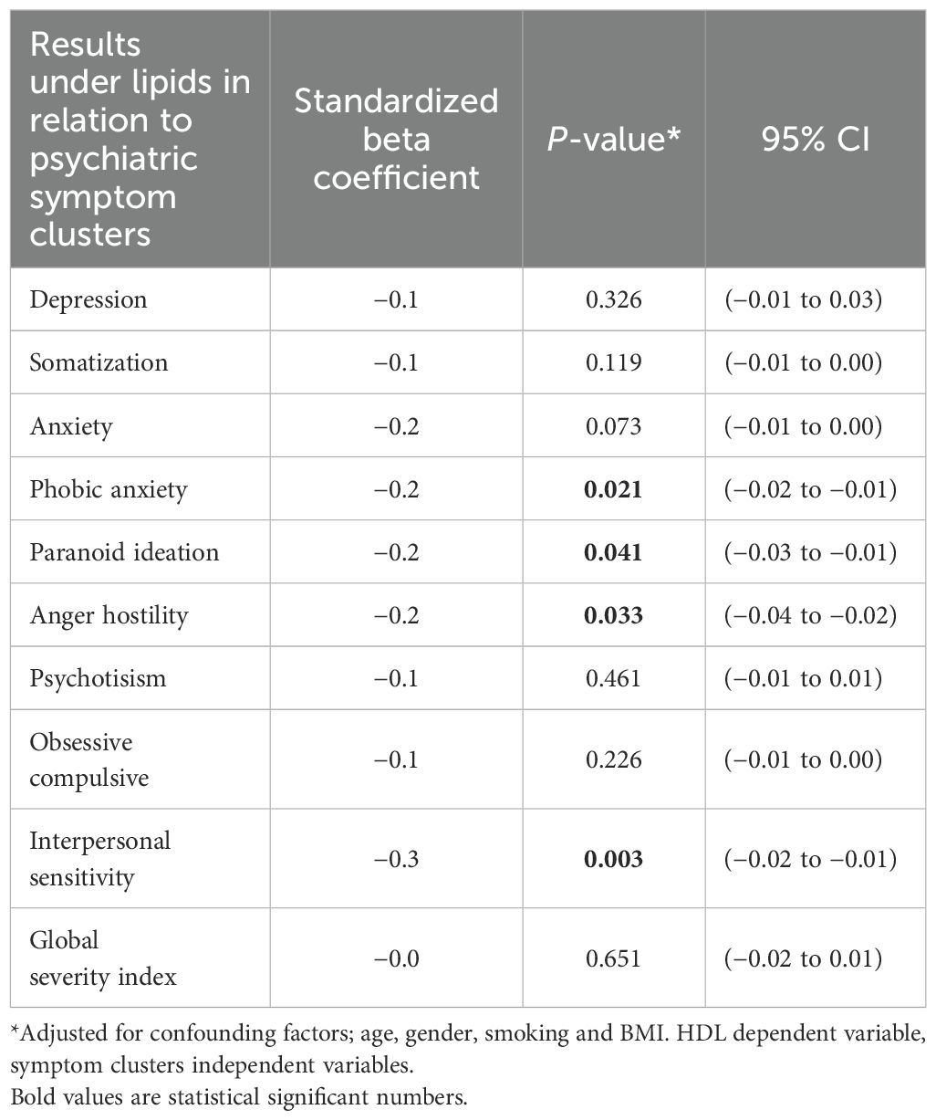 Results: After correcting for the most common confounding factors, HDL was negatively associated with intensity of phobic anxiety (p=0.021), paranoid ideation (p=0.041), anger hostility (p=0.033) and interpersonal sensitivity (p=0.003) symptom clusters. No relations were found between TG, LDL and symptom clusters.