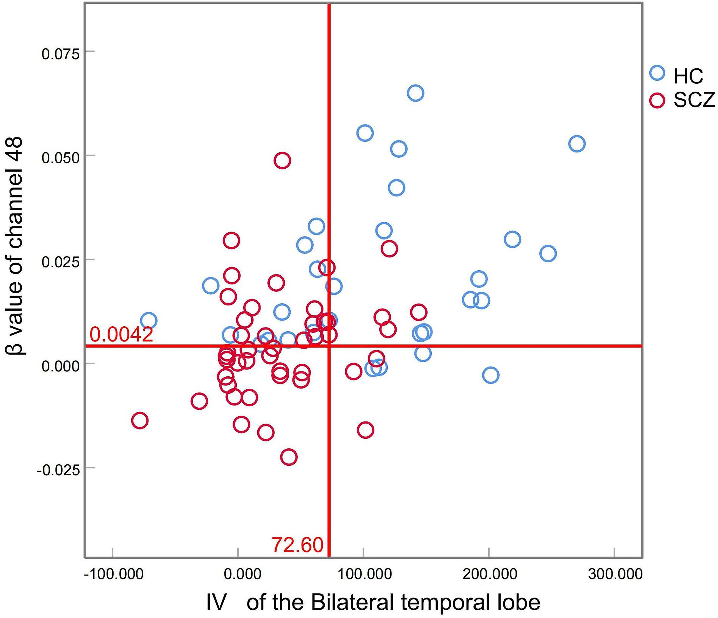 Binary logistic regression analysis revealed that IV from bilateral temporal regions and β-values from channel 48 served as significant neurophysiological predictors for schizophrenia diagnosis (Table 4). Diagnostic performance evaluation demonstrated distinct discriminatory capacities: IV of the bilateral temporal lobes achieved an AUC of 0.781, and the β value of channel 48 yielded an AUC of 0.762 (Table 5, Figure 1). Combined implementation of these biomarkers provided an AUC of 0.820 (95%CI:0.720-0.920). Using the optimal feature thresholds, scatter plots for IV of the bilateral temporal lobes and β value of channel 48 for each group are shown in Figure 2.