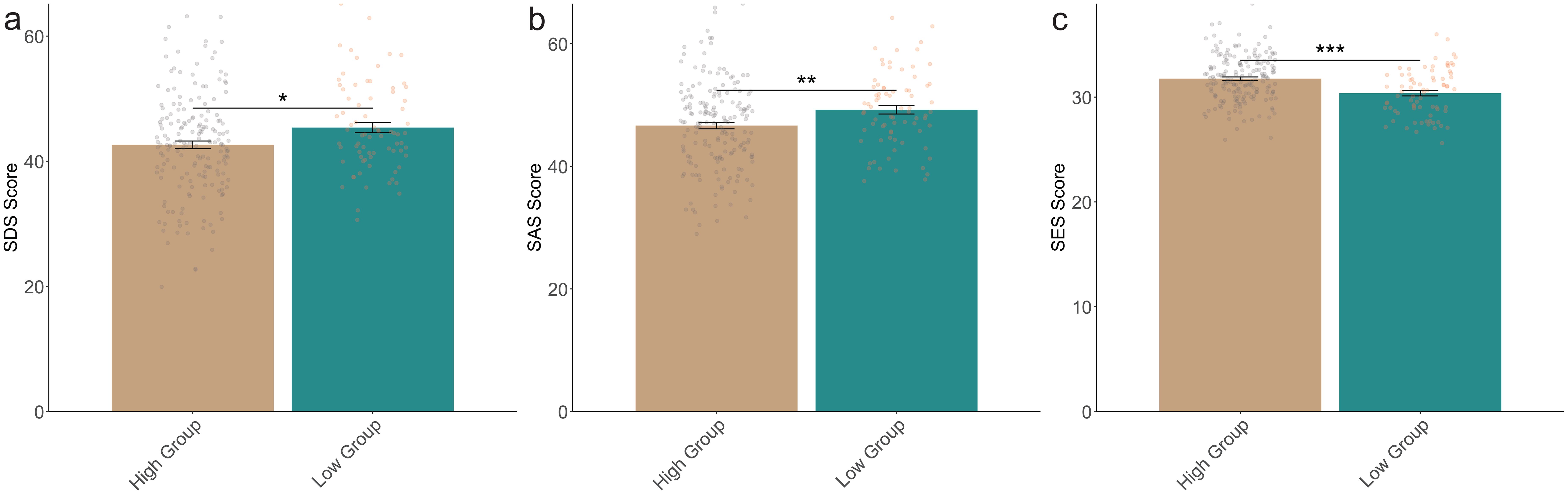 Figure 1. Psychological assessment of two groups of patients upon enrollment. (A): SDS Score; (B): SAS Score; (C): SES Score. SDS, Self-rating Depression Scale; SAS, Self-rating anxiety scale; SES, Self-Esteem Scale. *: P<0.05; **: P<0.01; ***: P<0.001.