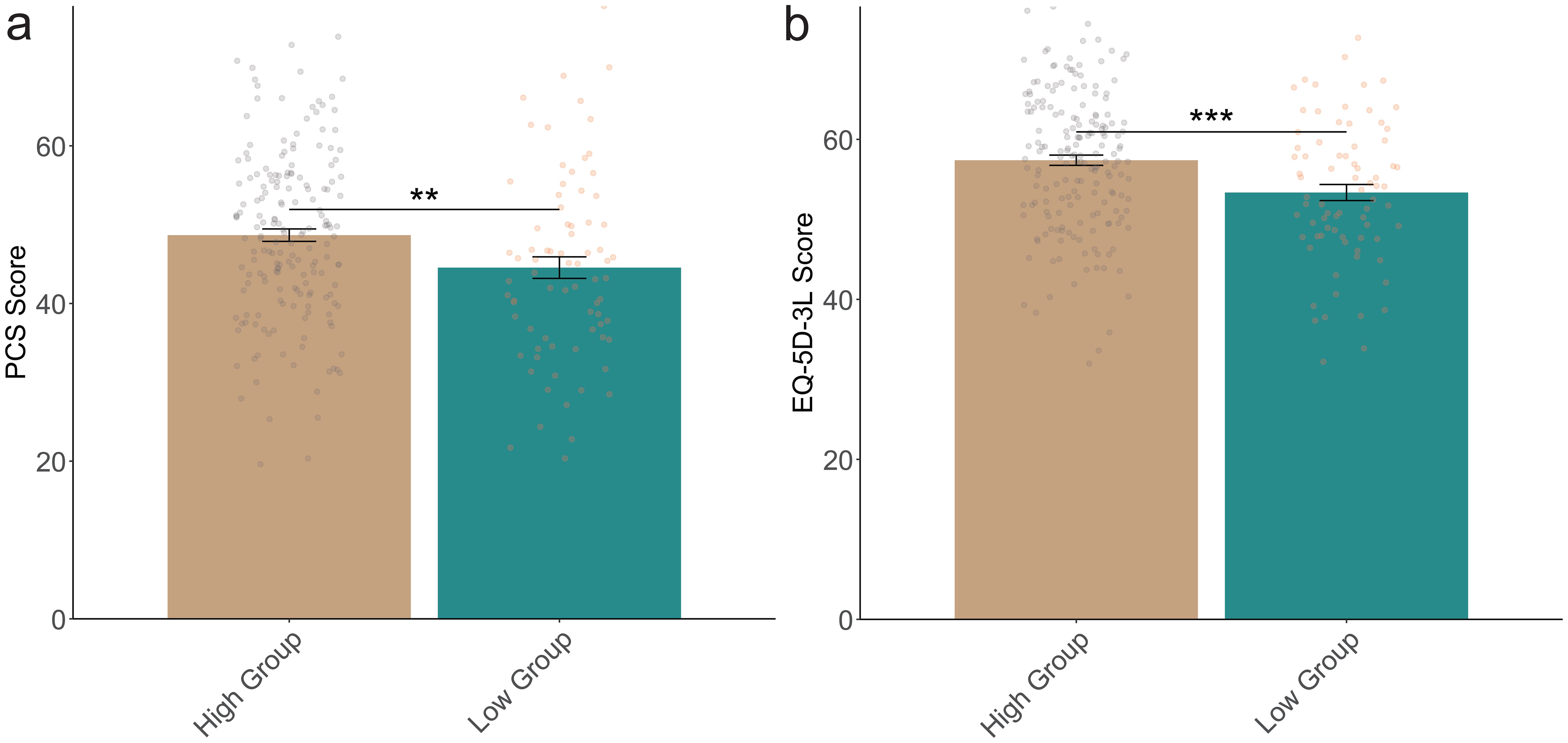 Upon enrollment, the health status assessment revealed significant differences in physical health and overall quality of life between the high and low effect groups. The high group reported a higher Physical Component Summary (PCS) score, indicating better physical health, with a mean of 48.67 ± 10.61 compared to 44.55 ± 11.93 in the low group (t=2.736, P=0.007) (Figure 2). Additionally, the EuroQol five-dimension three-level (EQ-5D-3L) score, which reflects overall health-related quality of life, was significantly higher in the high group at 57.39 ± 8.63, compared to 53.36 ± 8.77 in the low group (t=3.408, P < 0.001). These results suggest that better baseline physical health and quality of life are associated with more significant improvements in emotional intelligence following sleep therapy.