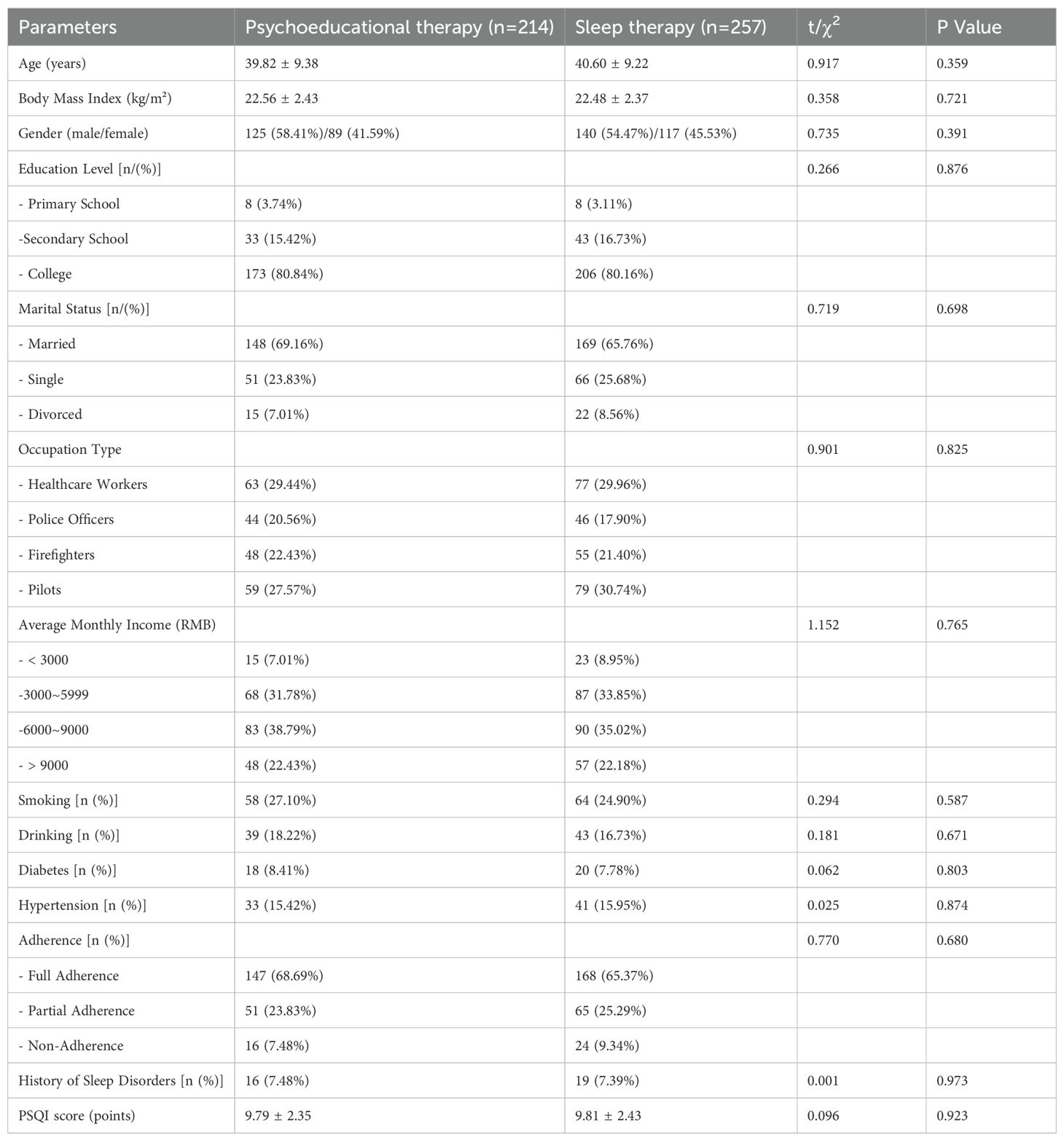 In the study population, demographic and baseline characteristics were compared between participants undergoing psychoeducational therapy and those receiving sleep therapy (Table 1). No significant differences were observed across a range of parameters (all P > 0.05). These findings indicate that the two groups were well-matched at baseline, enhancing the comparability of the intervention effects between psychoeducational therapy and sleep therapy.