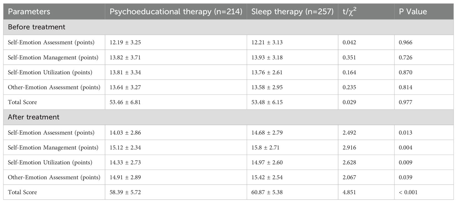 Before treatment, there were no significant differences between the two groups in terms of Self-Emotion Assessment, Self-Emotion Management, Self-Emotion Utilization, Other-Emotion Assessment, and Total Score (all P > 0.05), indicating similar baseline emotional statuses and capabilities (Table 2). After treatment, significant differences were observed across several measures. The sleep therapy group demonstrated significantly higher scores than the psychoeducational therapy group in Self-Emotion Assessment (P = 0.013), Self-Emotion Management (P = 0.004), Self-Emotion Utilization (P = 0.009), and Other-Emotion Assessment (P = 0.039). Additionally, a significant difference was found in the Total Score between the two groups post-treatment (P < 0.001), favoring the sleep therapy group. These results suggest that compared to psychoeducational therapy, sleep therapy may be more effective in enhancing participants’ abilities in various aspects of emotional assessment and management following the intervention period.