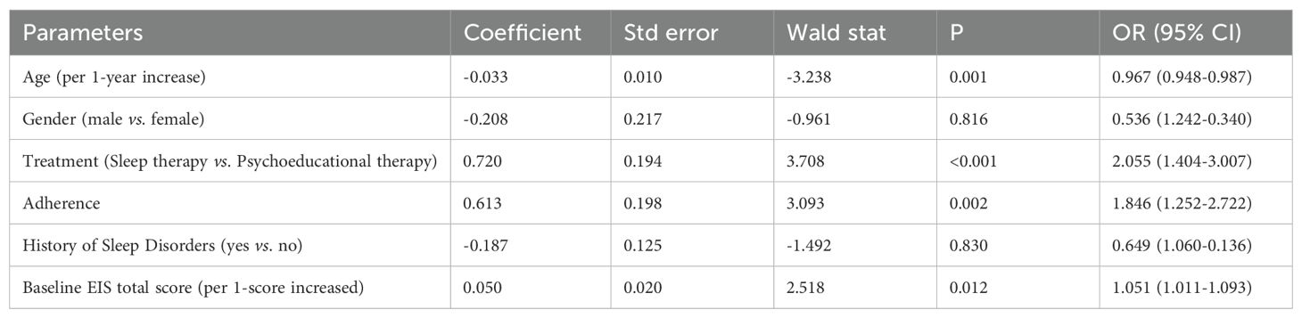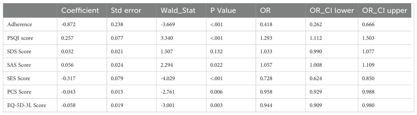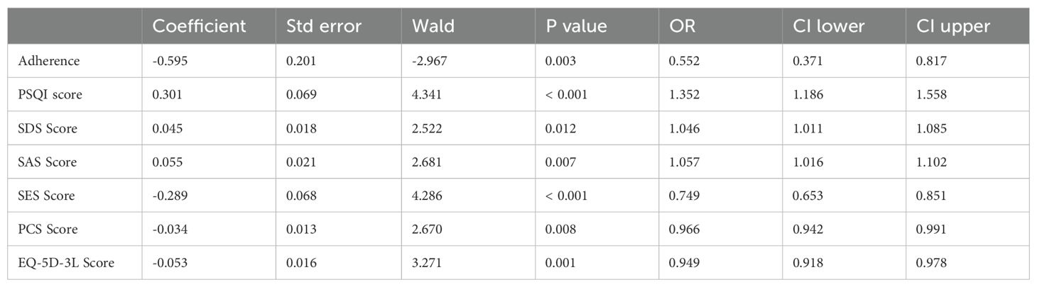 The single-factor logistic regression analysis identified several significant predictors of the poor treatment effect of sleep therapy (Table 6). Higher adherence was associated with reduced odds of poor treatment outcomes (Coefficient=-0.595, P=0.003, OR=0.552, 95% CI: 0.371–0.817). Conversely, increased PSQI scores were linked to higher odds of poor outcomes (Coefficient=0.301, P < 0.001, OR=1.352, 95% CI: 1.186–1.558), as were higher SDS (P=0.012) and SAS scores (P=0.007), with ORs of 1.046 and 1.057, respectively. Notably, higher SES and PCS scores were associated with better treatment outcomes (SES Coefficient=-0.289, P < 0.001, OR=0.749; PCS Coefficient=-0.034, P=0.008, OR=0.966), while the EQ-5D-3L also indicated a protective effect (Coefficient=-0.053, P=0.001, OR=0.949).