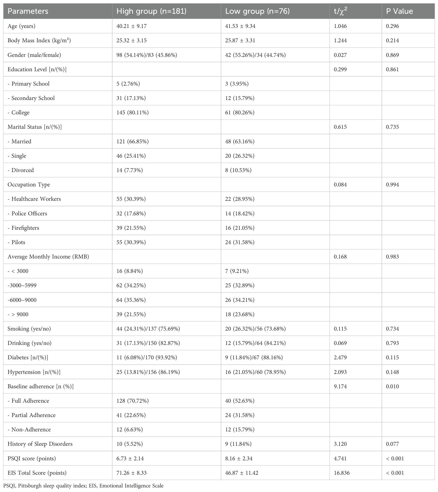 For the case-control study, the grouping criteria were established to compare the emotional intelligence levels of patients before and after a 12-week sleep therapy (ST) intervention. Based on their emotional intelligence scores following the intervention, participants were categorized into two groups: a high emotional intelligence group consisting of 181 individuals, each with a total score exceeding 60 points on the Emotional Intelligence Scale (EIS), and a low emotional intelligence group comprising 76 individuals, each with a total score of 60 points or lower. In this study, we selected a total EIS score of 60 as the clinical cutoff for group classification. This is because the maximum score on the EIS is 80, and a score of 60 represents 75% of the total possible score. In behavioral science, a 75% score is often used to determine whether an individual has reached a “good” or “proficient” level in a particular psychological construct. Therefore, this threshold helps us identify individuals who have shown significant improvement in emotional intelligence and notable functional enhancement in clinical practice.