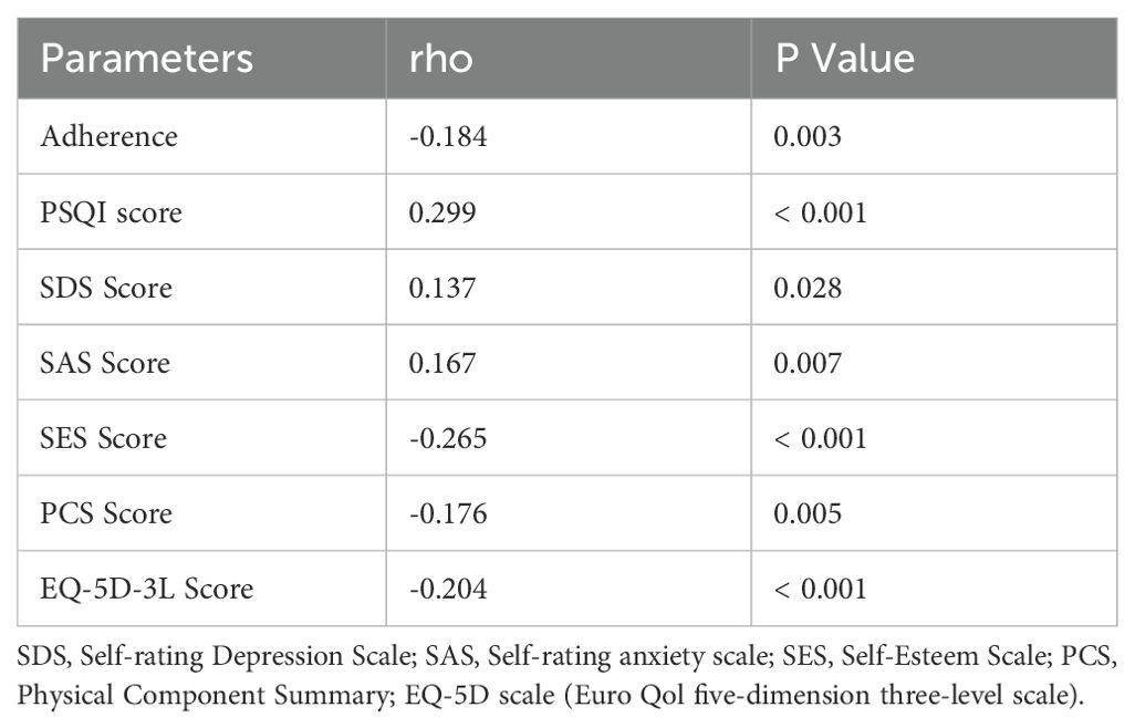 Correlation analysis demonstrated several significant associations between parameters and the efficacy of sleep therapy on emotional intelligence (Table 5). Adherence to therapy displayed a negative correlation with poor treatment effect (rho=-0.184, P=0.003), suggesting that higher adherence is linked to better outcomes. A positive correlation was observed between the Pittsburgh Sleep Quality Index (PSQI) score and poor treatment effect (rho=0.299, P < 0.001), indicating that poorer sleep quality is associated with reduced efficacy. Both the Self-rating Depression Scale (SDS) and Self-rating Anxiety Scale (SAS) scores showed positive correlations with poor treatment outcomes (rho=0.137, P=0.028 and rho=0.167, P=0.007, respectively), highlighting the negative impact of depressive and anxiety symptoms. Conversely, the Self-Esteem Scale (SES) score was negatively correlated with poor treatment effect (rho=-0.265, P < 0.001), implying that higher self-esteem predicts better outcomes. Similarly, the Physical Component Summary (PCS) and EQ-5D-3L scores were negatively correlated with poor treatment effect (rho=-0.176, P=0.005 and rho=-0.204, P < 0.001, respectively), suggesting that better physical health and quality of life enhance the therapy’s efficacy. These findings underscore the importance of adherence, baseline psychological well-being, and overall health in improving the therapeutic outcomes of sleep therapy.