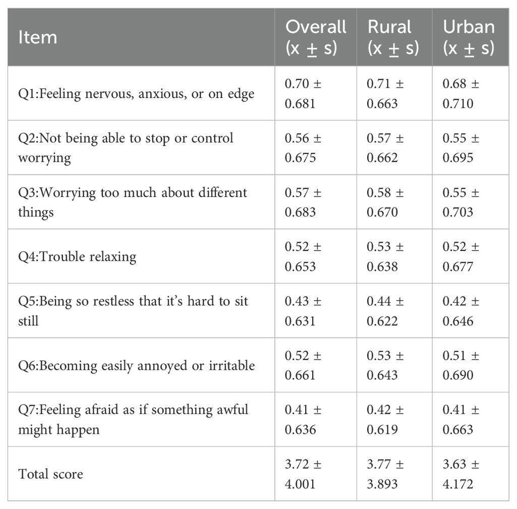 The GAD-7 scale was utilized to evaluate anxiety symptom prevalence and severity in the research cohort. This instrument consists of seven questions, each scored on a 4-point Likert scale ranging between 0 and 3. The scoring criteria are defined as: 0 = “never,” 1 = “occasionally,” 2 = “frequently,” and 3 = “daily.” Scores below 5 suggest no significant anxiety symptoms, while scores ≥5 indicate clinically relevant anxiety (24). During this investigation, the GAD-7 demonstrated exceptional internal consistency with a Cronbach’s alpha value of 0.944, with 0.942 for the rural university student group and 0.947 for the urban university student group.