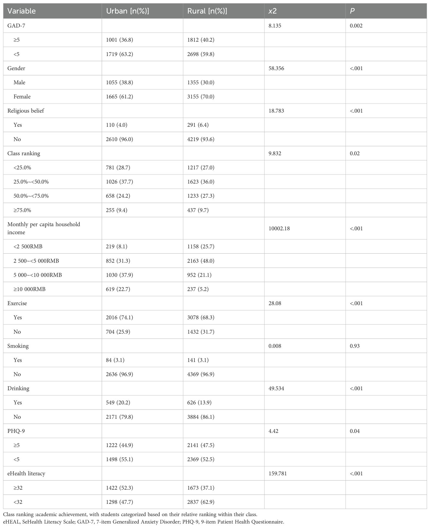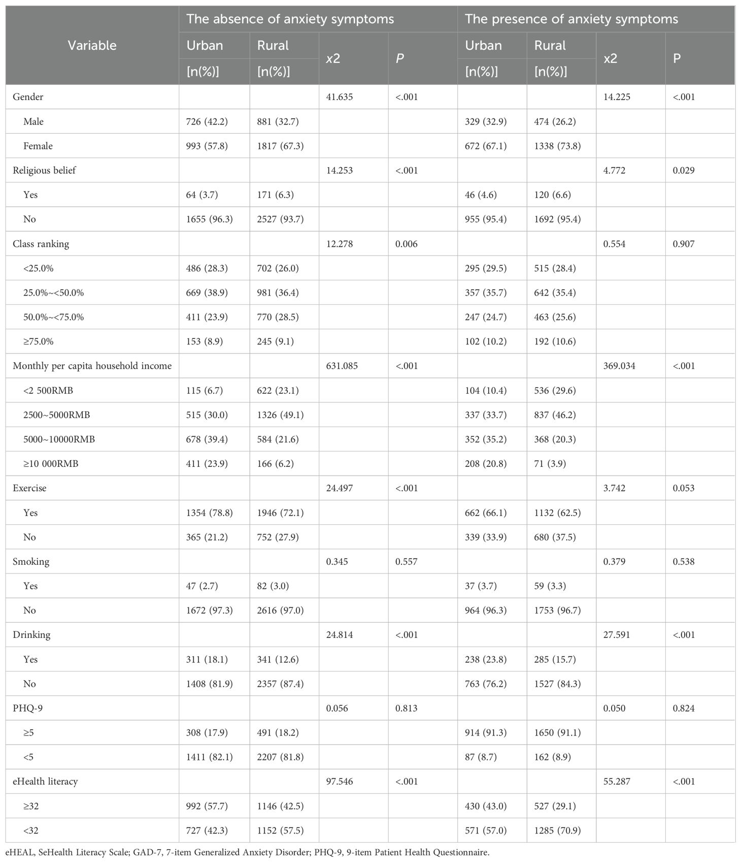 The study included a total of 7,230 samples. The average GAD-7 score of college students was 3.72±4.001 (Table 1). A score of 5 or less indicates no anxiety symptoms, and a score of 5 or more indicates the presence of anxiety symptoms. The results of Table 2 showed that 4417 college students (61.09%) had no anxiety symptoms, and 2813 college students (38.91%) had anxiety symptoms. The results of the chi-square test in Table 2 show that there are significant differences in the distribution of the eight covariates between urban and rural college students. These covariates included gender, religion, class ranking, monthly per capita household income, exercise, drinking, PHQ-9 score, and eHealth literacy score. However, no significant differences were found in the distribution of smoking factors.