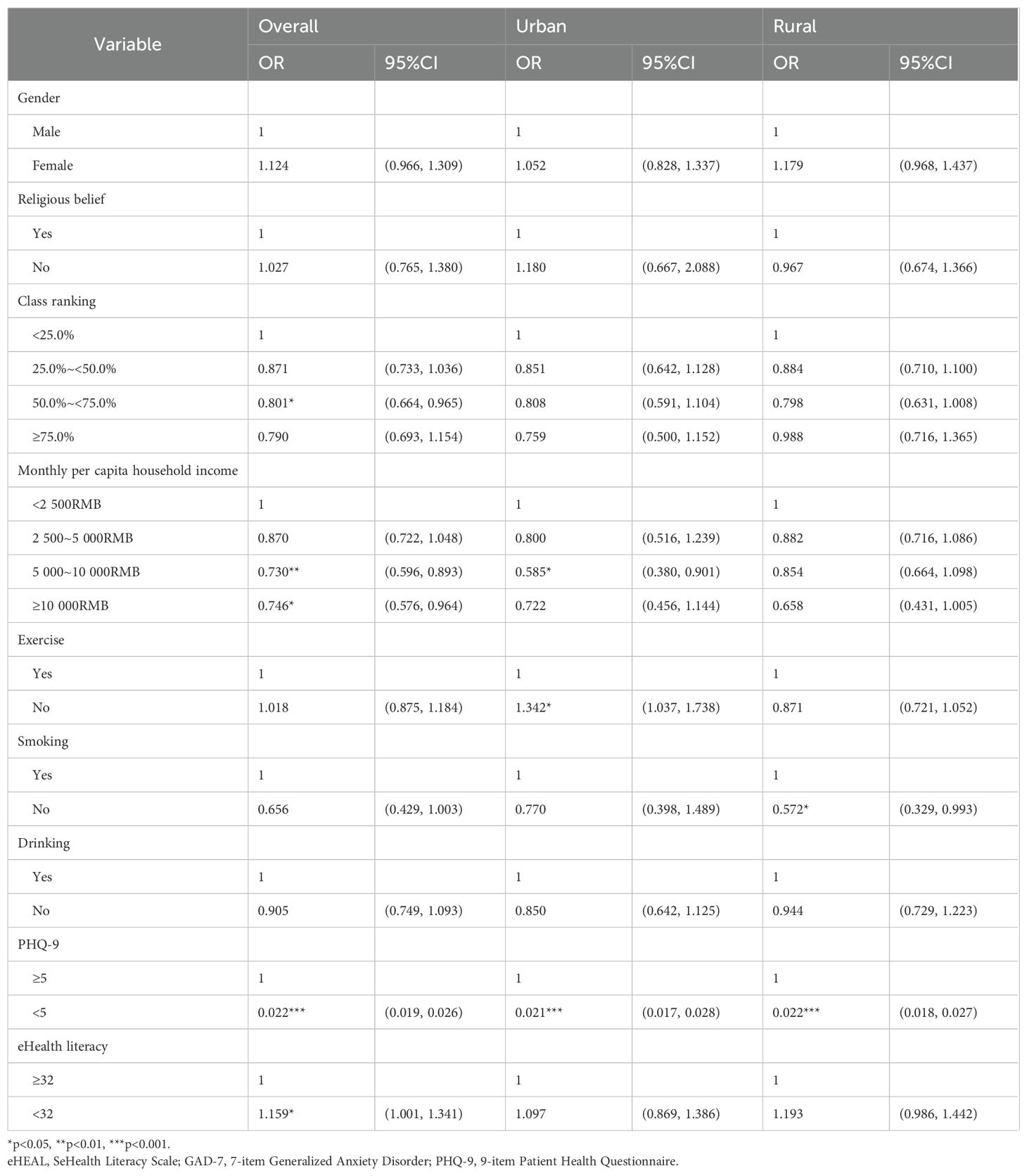 Table 3 shows the relationship between the distribution of covariates among urban and rural college students and the presence of anxiety symptoms. The data indicates that certain covariates exhibit similar characteristics among students assessed for the presence or absence of anxiety symptoms. The following factors were identified as being associated with anxiety symptoms in college students: gender, religious belief, monthly per capita household income, drinking, and eHealth literacy level. Although results for both the absence and presence groups are presented in Table 3 to provide a more comprehensive picture of the population, our interpretation in the Results and Discussion sections primarily focuses on the presence of anxiety symptoms, as this represents the main objective of the study.