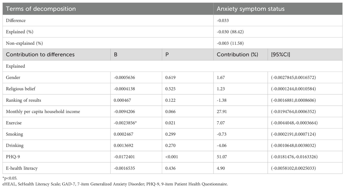 In this study, we applied a multivariate Fairlie decomposition analysis (FDA) based on a binary regression model. FDA is one of the decomposition techniques used in multivariate models to quantify the contribution of predicted differences between two groups to outcome variables. The method is an extension of the Blinder-Oaxaca decomposition analysis, which has been widely criticized for its inefficiency in handling the logit and probit model. The FDA was developed specifically for nonlinear regression models, including logit and probit models (30). The FDA identifies the contribution of independent variables to explaining differences between groups by calculating the change in the mean predicted probability resulting from substituting one independent variable at a time in one group (e.g., Group A - rural university students) while holding other variables constant in the other group (e.g., Group B - urban university students). The Fairlie decomposition technique works by limiting the predicted probability to between 0 and 1.Studies have shown that the FDA can better quantify the contribution and significance levels of different variables for nonlinear regression models (31, 32). Given that the dependent variable was a dichotomous variable, we employed Fairlie’s nonlinear decomposition to decompose the discrepancies in university students’ eHealth literacy into the contributions of various factors. In this context, the Fairlie decomposition method was chosen over the traditional Oaxaca-Blinder approach for several reasons. First, our outcome variable—presence or absence of anxiety symptoms—is binary, which renders linear decomposition methods such as Oaxaca-Blinder less suitable. The Fairlie method was specifically developed to handle non-linear models like logistic regression, making it a more appropriate choice for our analysis. Second, we acknowledge that the Fairlie decomposition is sensitive to the ordering of covariates, which may introduce variability into the estimated contributions. To mitigate this limitation, we followed Fairlie’s recommendation and conducted 100 randomized replications of the decomposition process using Stata MP 18.0, averaging the results to reduce the impact of variable ordering. This approach has been demonstrated in previous studies to enhance the stability and reliability of decomposition results. Third, the Fairlie method has been widely adopted in public health and economics research to examine disparities in binary outcomes, including studies of racial disparities in healthcare access, health insurance coverage, and mental health conditions. Its strong theoretical foundation and demonstrated applicability to health inequality studies support its use in the present research (33). As outlined by Fairlie (34), the decomposition of the nonlinear equation can be expressed as follows: