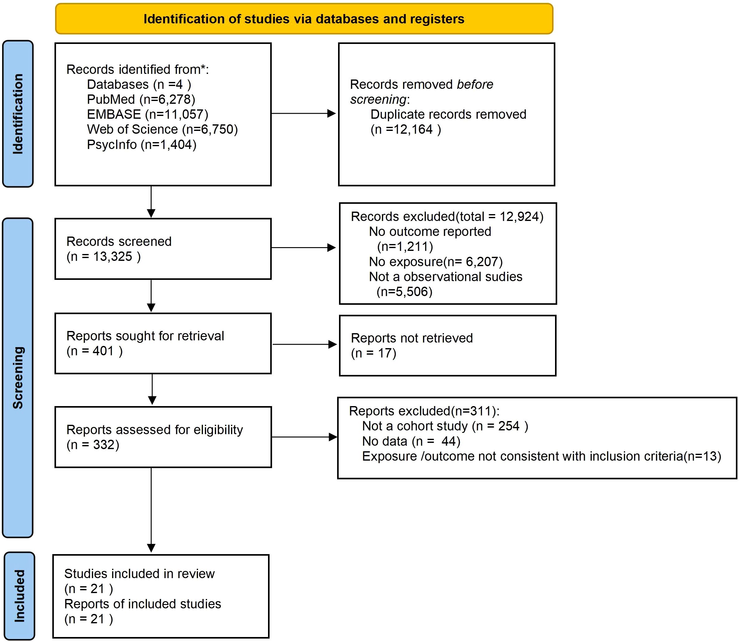 To address these limitations, we conducted a PRISMA-guided systematic review and meta-analysis that exclusively includes cohort studies, reflecting the stronger capacity of longitudinal designs to establish exposure–outcome ordering and reduce selection bias (21). We prespecified harmonized effect measures for binary and continuous outcomes, prioritized clinically interpretable units where feasible, and planned subgroup and sensitivity analyses to explore heterogeneity by age, region, and socioeconomic status.
