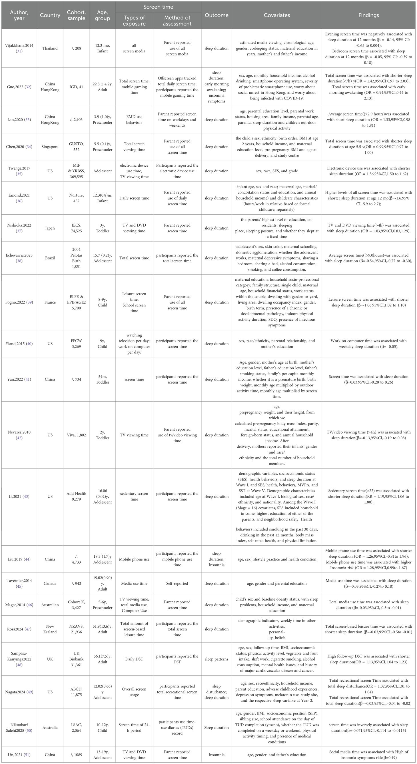 Prior research on the correlation between screen time and sleep outcomes has been conducted on individuals below the age of 18 (15–19). In this study, in comparison to previous studies, the population is defined as all individuals, without any restrictions. Secondly, with regard to the type of study, only cohort studies were selected, which allows for a more robust demonstration of the association between screen time and sleep duration. Furthermore, additional subgroup analyses were conducted to elucidate the source of heterogeneity.