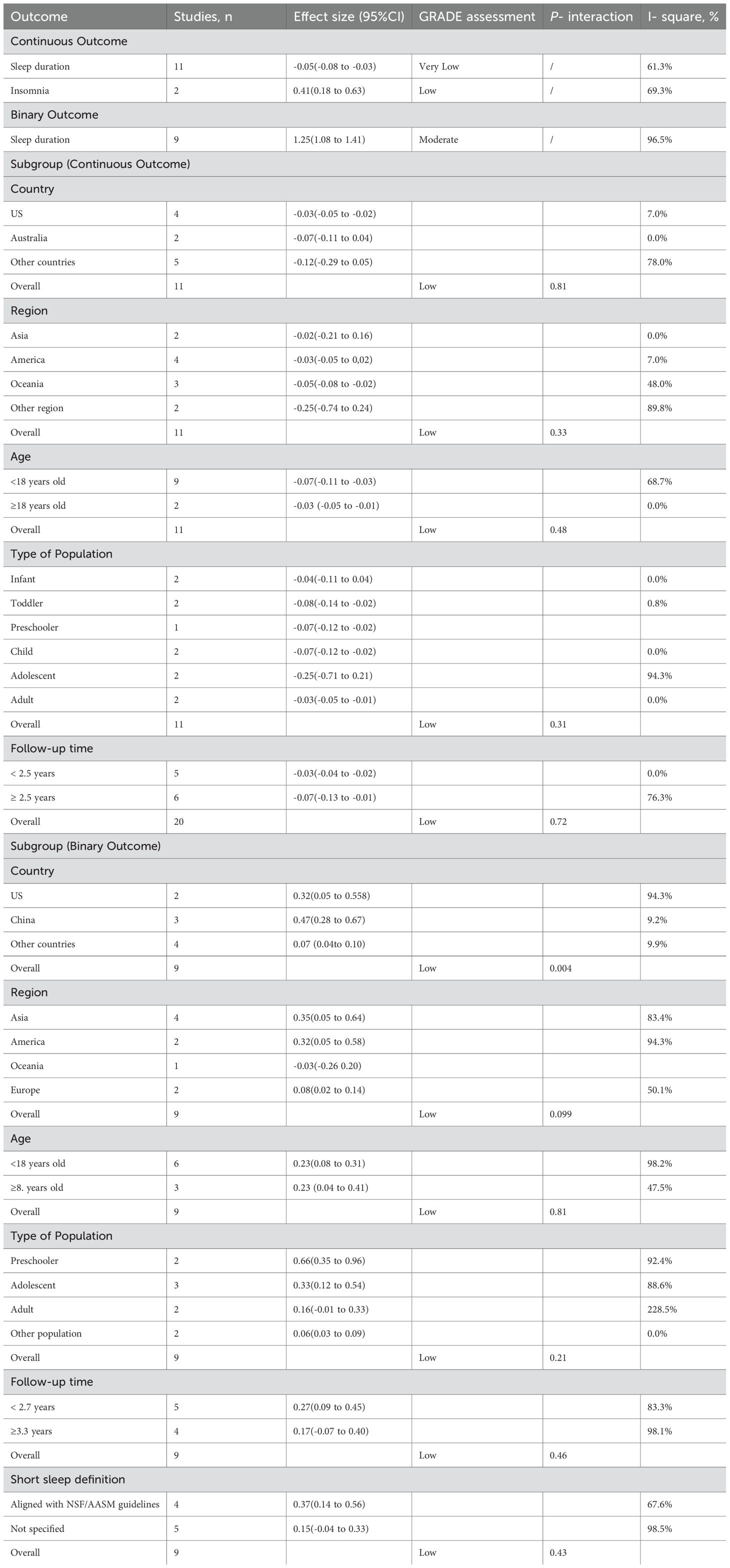 We conducted subgroup and corresponding meta-regression analyses by country, region, age group, population type, and follow-up duration (Supplementary Table 2 and Table 3). According to WHO classification (52), only one study was conducted in a middle-income country, while the remaining studies were from high-income settings; therefore, income-based subgroup analysis was not performed. For continuous outcomes, there were no significant differences in the association between screen time and reduced sleep duration across countries (P interaction=0.81) or regions (P interaction=0.33). The association also did not differ significantly by age group (rou vs. <18 years; P interaction=0.48, population type (P interaction=0.31), or follow-up duration, which was dichotomized at the median value of 2.7 years (P interaction=0.72). Subgroup analysis by risk of bias was not conducted, as all included studies were assessed as having moderate risk. For binary outcomes, subgroup and meta-regression analyses were similarly conducted. A significant difference was observed by country (P interaction= 0.004), suggesting that the association between screen time and the odds of short sleep varied across countries. However, no significant effect modification was found across regions (P interaction= 0.099), age groups (P interaction= 0.81), population types (P interaction= 0.21), short sleep definition (P interaction= 0.43) or follow-up duration, which was dichotomized at the median value of 2.5 years (P interaction= 0.46)(Table 2). Subgroup analysis by risk of bias was not performed, as only one study was rated as high risk, while the remaining studies were assessed as having moderate risk. Details of short sleep definitions are provided in the Supplementary Material 2.