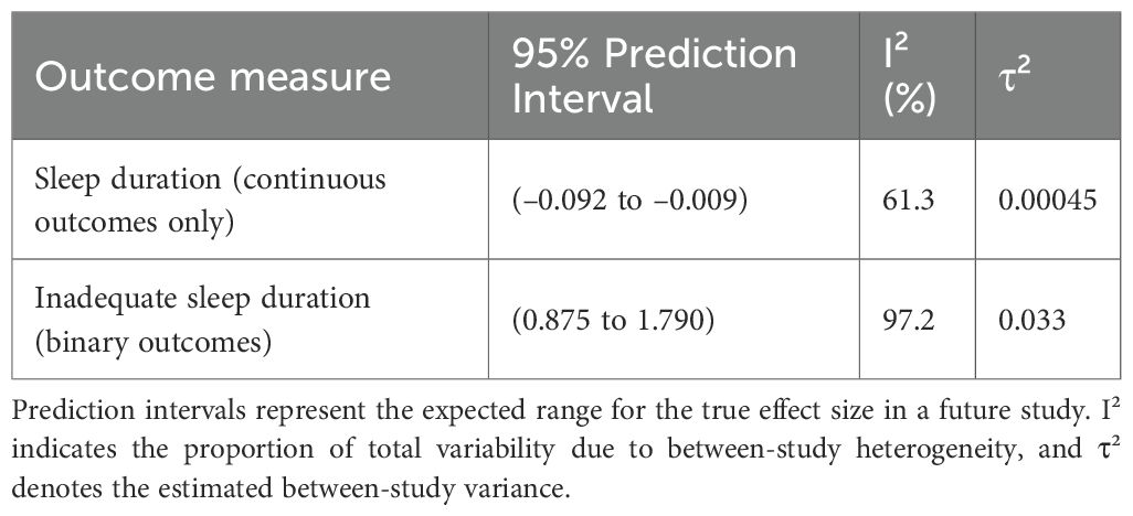 Random-effects meta-analysis was conducted as the primary analysis to obtain pooled estimates, with heterogeneity assessed using the I² statistic and the between-study variance (τ²). Random-effects meta-regression with Knapp–Hartung adjustment was applied to account for between-study heterogeneity and to calculate 95% prediction intervals, estimating the likely range of effect sizes in future studies (30). Fixed-effect meta-analysis was performed as a sensitivity analysis to assess the robustness of results. Additionally, we conducted sensitivity analyses excluding studies with high risk of bias and those using objective sleep outcome measures to further examine the influence of study quality and measurement method on the overall estimates. Prespecified subgroup analyses were conducted when at least two studies were available, with tests of interaction used to evaluate whether subgroups differed significantly (P interaction ≤0.05). Subgroup factors included population type (infant, toddler, preschooler, child, adolescent, adult); age (>18 years vs. <18 years); risk of bias (high vs. low); country (China, US, UK, Australia, other), income (income, USD, 1,146–14,005 USD, >14,005 USD, according to World Bank thresholds); region (Asia, America, Oceania, Europe, other);follow-up time, dichotomized by outcome type: >2.7 years vs. ≤s.r years for continuous outcomes, and >2.5 years vs. ≤s.r years for binary outcomes; short sleep definition (aligned with the National Sleep Foundation (NSF)/the American Academy of Sleep Medicine(AASM) guidelines vs. not specified for binary outcome).Publication bias was assessed using Egger’s regression test and visual inspection of funnel plots, but only for meta-analyses including ten or more studies, as small-study bias tests are underpowered when k < 10.