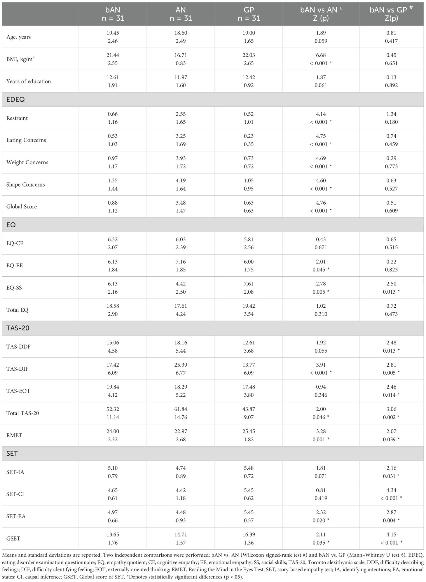 Notably, the bAN group significantly differed from the GP group on several scales: EQ-SS (r = 0.361), TAS-DIF (r = 0.363), TAS-EOT (r = 0.360), TAS-20 Total (r = 0.450), RMET (r = 0.302), SET-IA (r = 0.291), SET-CI (r = 0.594), and SET-EA (r = 0.381). Comparisons between bAN and AN also revealed differences in SET-EA (r = 0.314), SET-EE (r = 0.313), SET-SS (r = 0.388), TAS-DDF (r = 0.348), TAS-DIF (r = 0.613), TAS-20 Total (r = 0.422), and eating psychopathology (all r > 0.700).