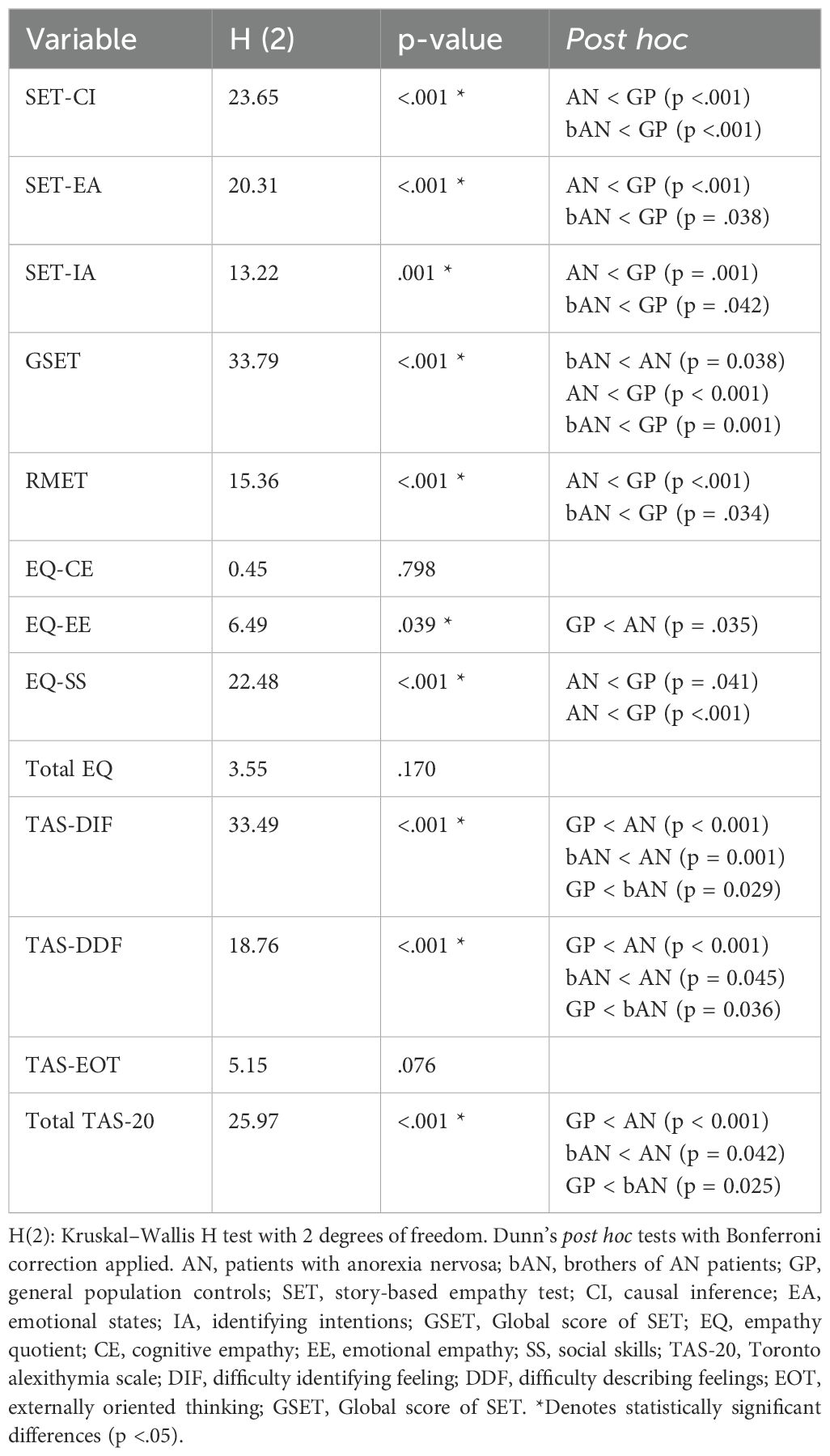 Building on these observations, the present study aimed to explore whether unaffected male siblings of women with AN display cognitive-emotional traits commonly associated with the disorder, even in the absence of clinical symptoms. We investigated empathy, theory of mind, and alexithymia in three distinct groups: brothers of women with AN (bAN), their affected sisters (AN), and men from the general population (GP).