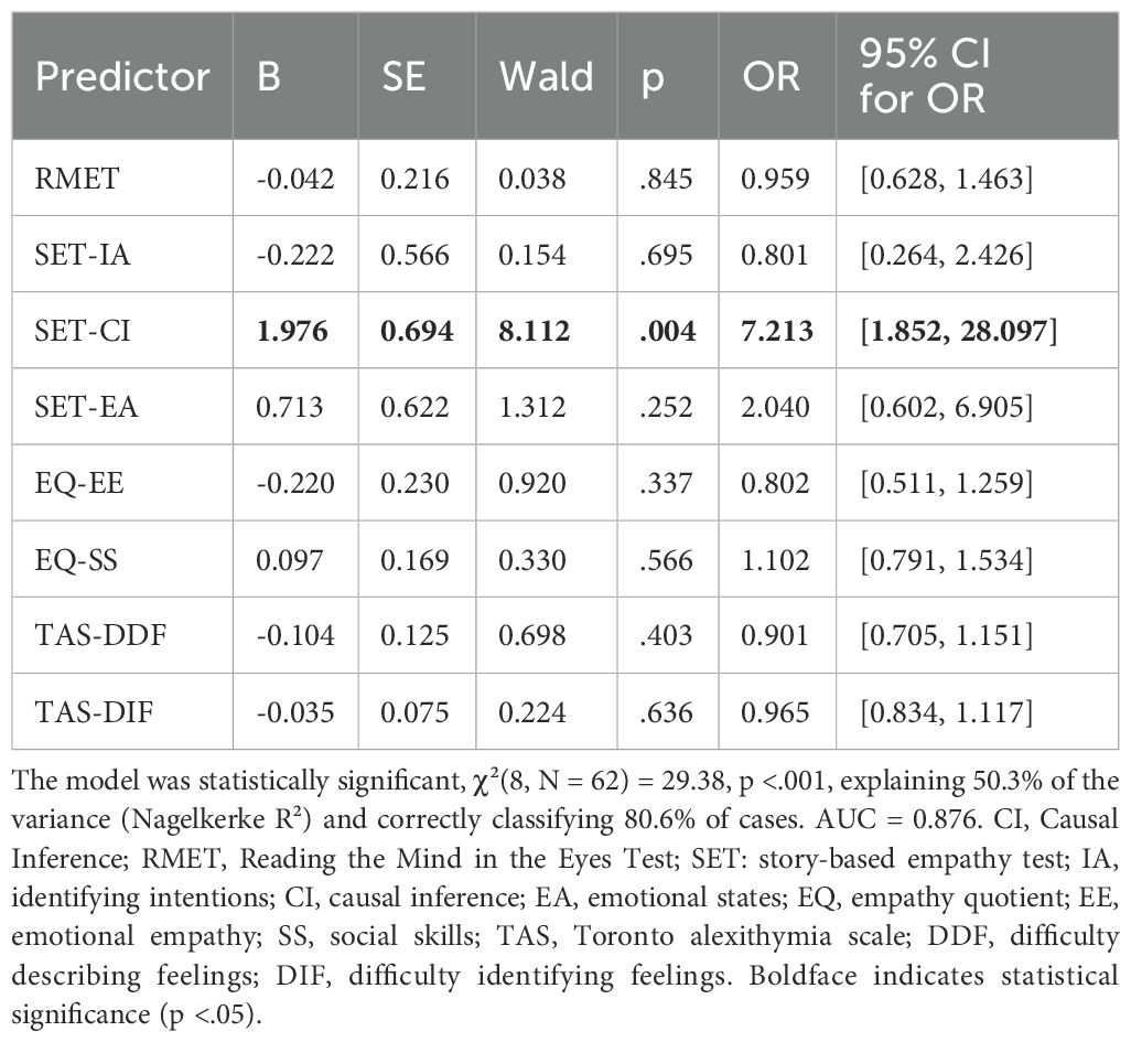 A binary logistic regression was then conducted to assess whether specific cognitive-emotional variables—namely, subscales related to theory of mind (ToM), empathy, and alexithymia—predicted group membership (bAN vs. GP). Eight predictors were selected based on both theoretical relevance and significant between-group differences in preliminary analyses. We acknowledge that this number approaches the limits of model stability given our sample size (N = 62), and interpret findings accordingly as exploratory. To assess potential multicollinearity, Variance Inflation Factor (VIF) values were calculated for all predictors; all were below 3.0, indicating acceptable independence among variables. Additionally, a sensitivity analysis was conducted by removing the SET-CI variable from the model.