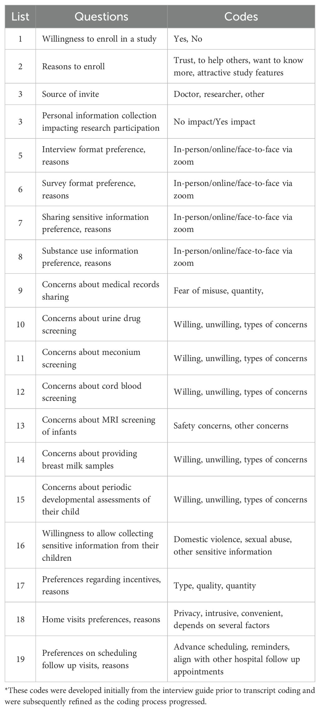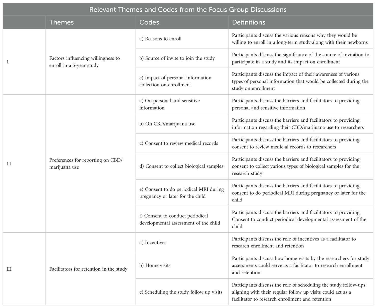 The FGD data was collected using a semi structured interview guide developed based on the framework informed by Kreuger & Casey (2020) (14). The focus of the interview guide was to understand the willingness and feasibility of recruiting and retaining pregnant and postpartum women for a longitudinal research study on the long-term outcomes of cannabis and CBD use during pregnancy. The semi structured interview guide was developed after extensive literature review and periodic review and inputs from experts in the field.
