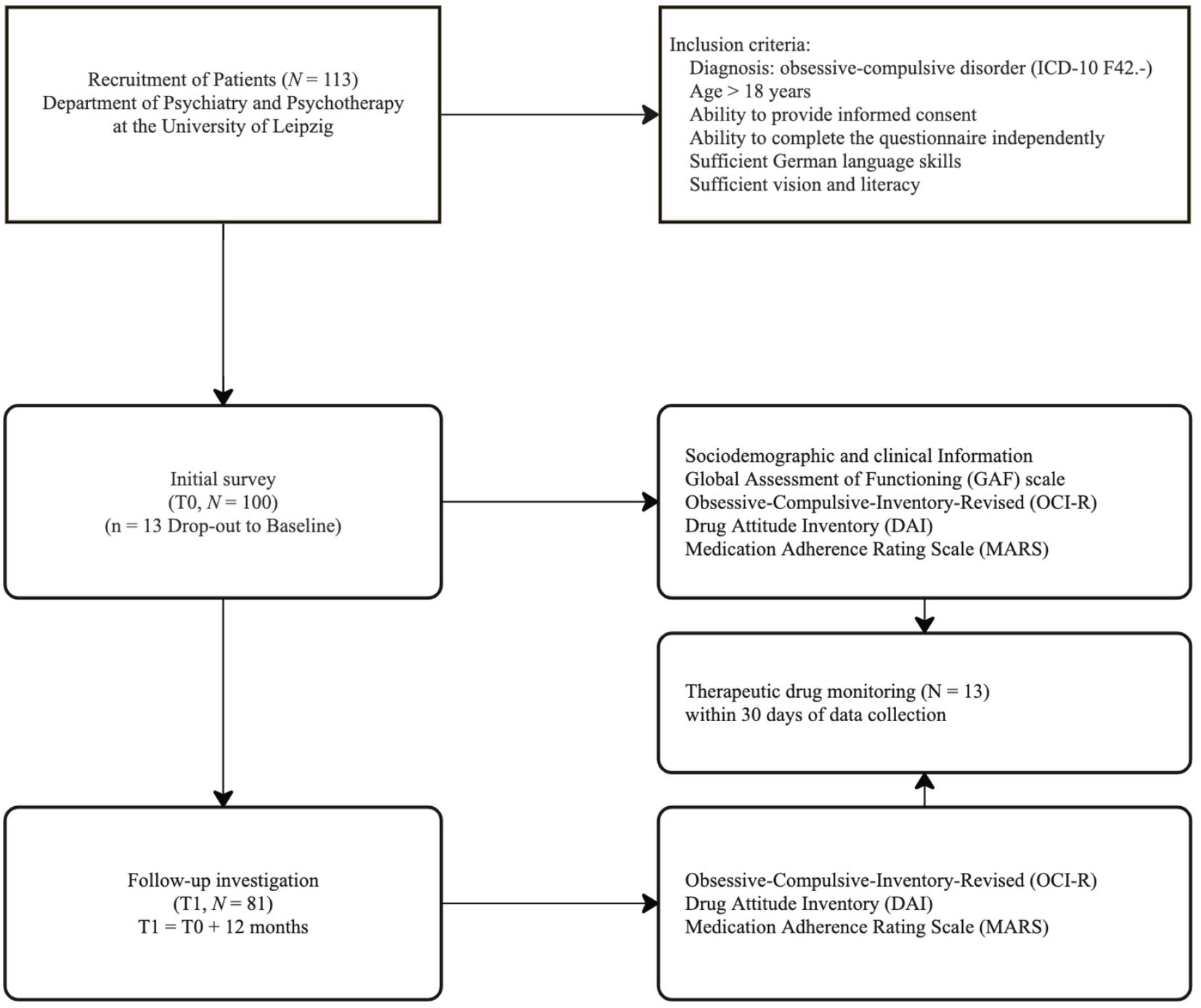 The initial investigation included all evaluation tools mentioned below. A total of N = 100 individuals completed this assessment in the initial survey T0 and were enrolled in the study. A total of N = 81 (81%) individuals took part in the follow-up investigation T1. Figure 1 provides the study flow chart. A subsample of participants (N = 13) who provided consent for blood sampling and had appointments scheduled within the study timeframe were included in the TDM subgroup. This pragmatic selection was based on feasibility considerations and ethics approval constraints.