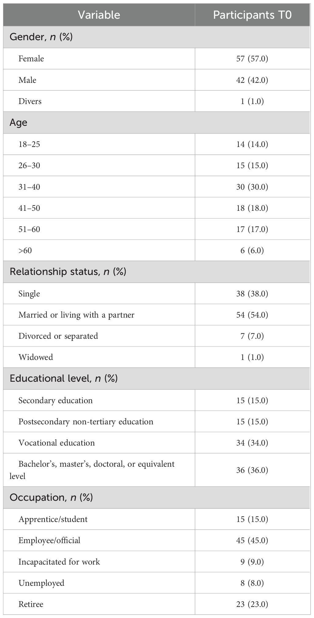 The sample consisted of N = 100 patients during the initial survey T0, of whom N = 81 (81%) participated during the follow-up investigation T1. Demographic characteristics are presented in Table 1. Most (57.0%, n = 57) of the participants were female, 42% were male (n = 42), and 1.0% (n = 1) were diverse with an age range of 18–82 years (M = 40.04, SD = 13.74).