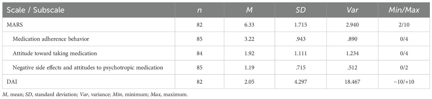 Concerning the reported attitudes toward medication, the mean DAI score for all participants (N = 82) was 2.05 (SD = 4.30), with a range from –10 to +10. However, three items showed negative mean values, which indicated a lack of agreement among the respondents: Item 9 (‘My thoughts are clearer on medication’, M = –0.13, SD = 1.00), Item 10 (‘By staying on medication, I can prevent getting sick’, M = –0.44, SD = 0.90), and Item 6 (‘I take my medication only when I am sick’, M = –0.13, SD = 1.00). Notably, Item 6 was reverse-coded, so a negative score reflected agreement with the statement. Across the MARS questionnaire, the mean score was 6.33 (SD = 1.72), with a range of 2–10 (N = 82) and a median of 6. For further details on the descriptive distribution, see Table 2.