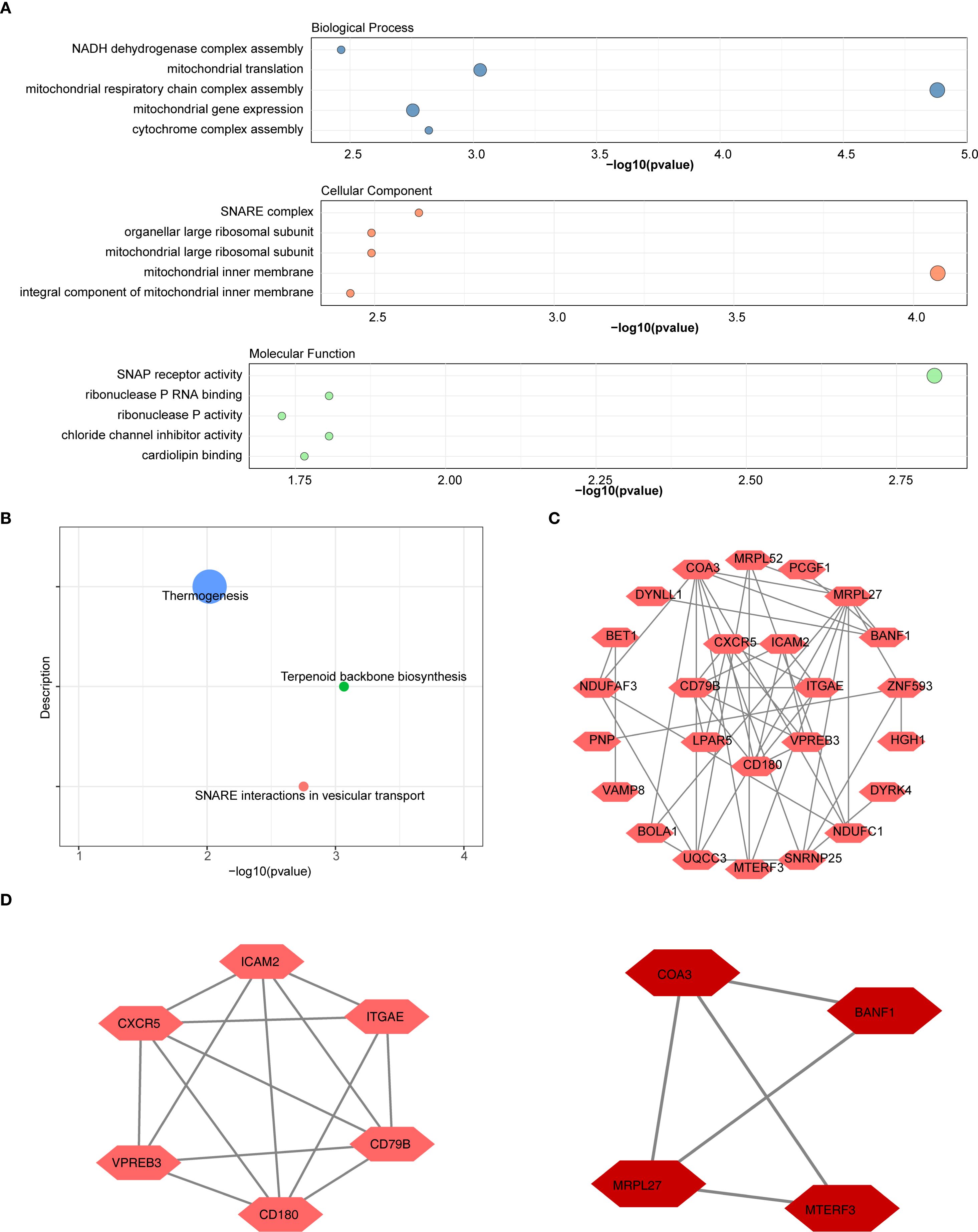 Figure 2. Functional enrichment and protein-protein interaction (PPI) network analysis of candidate genes. (A) GO Enrichment Analysis.The results of the functional enrichment analysis conducted on the 31 candidate genes. Significant GO terms included "mitochondrial respiratory chain complex assembly" (BP), "mitochondrial inner membrane" (CC), and "SNAP receptor activity" (MF) (B) KEGG pathway analysis of DEGs included "thermogenesis", "SNARE interactions in vesicular transport", and "terpenoid backbone biosynthesis". (C) PPI Network of Candidate Genes. Construction of the PPI network and selection of hub genes. (D) Two key modules in the PPI network were ascertained. The 10 genes within these two modules were selected as hub genes for further analysis.