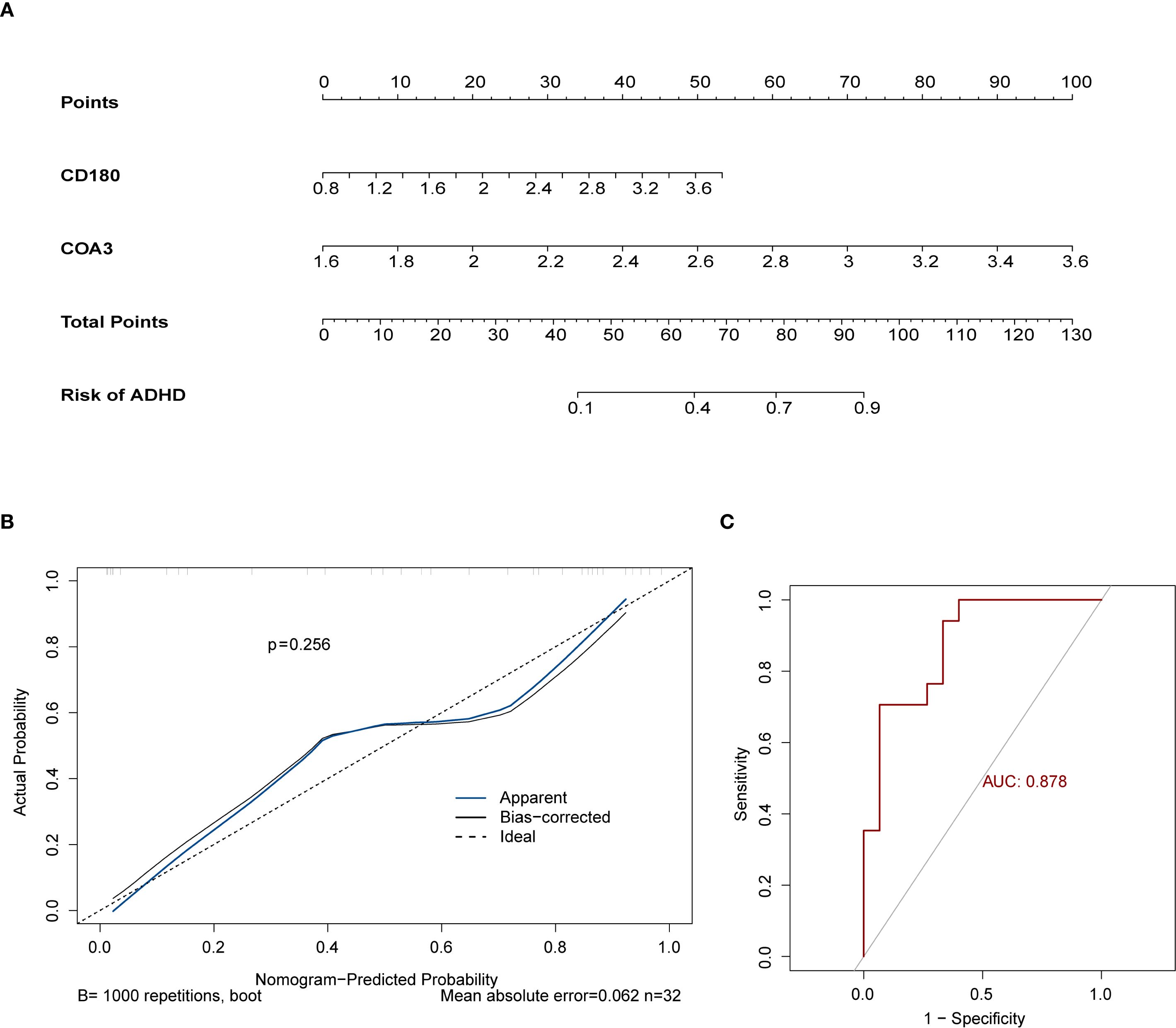 Figure 4. Development and validation of the ADHD risk prediction nomogram. (A) Nomogram for ADHD Risk Stratification. (B) Calibration Curve for Prediction Accuracy. (C) ROC Curve for Diagnostic Performance. The ROC curve indicated an AUC of 0.878 for the nomogram, highlighting its exceptional predictive performance.