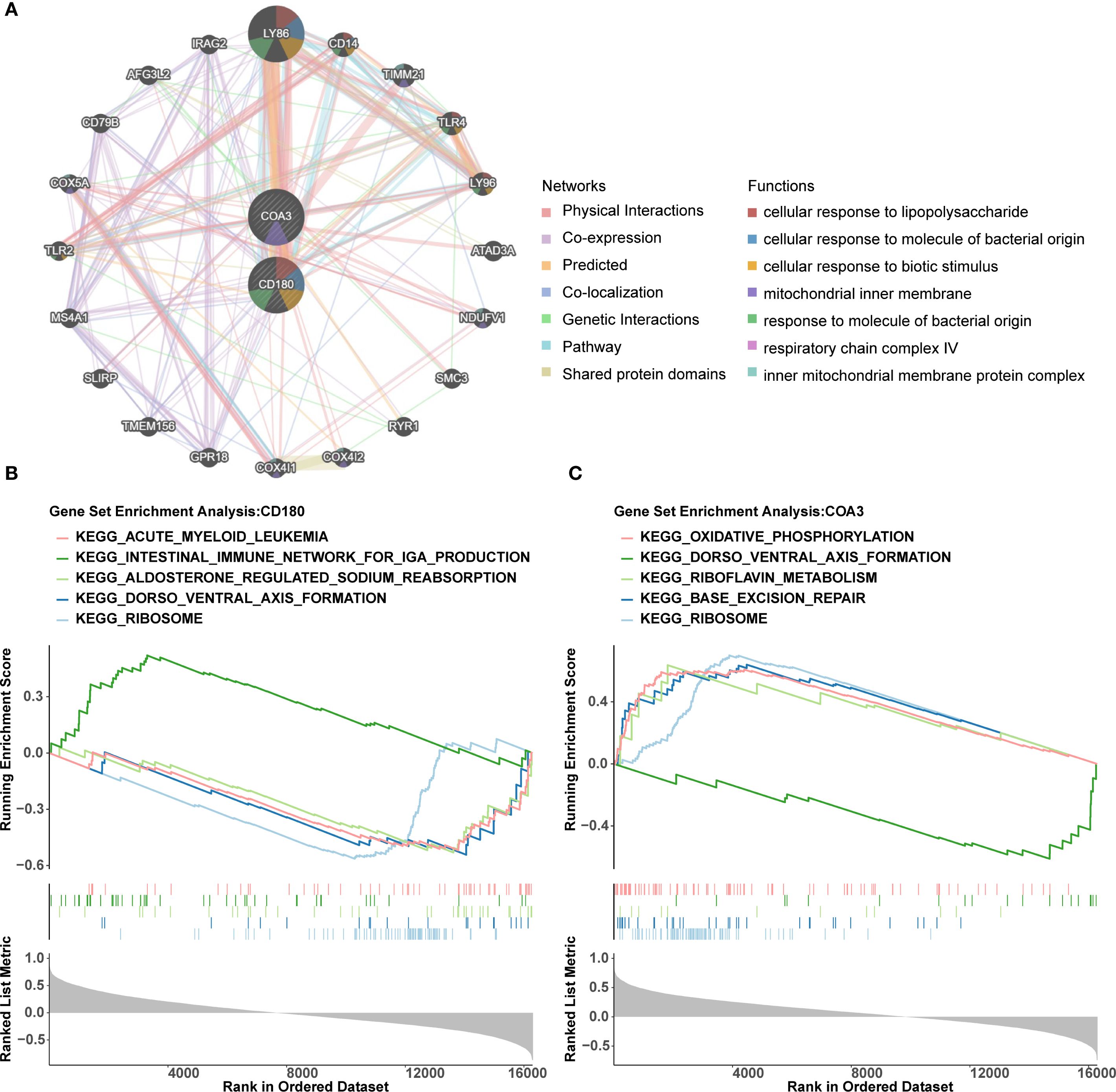 Figure 5. Functional networks and pathway enrichment of ADHD biomarkers CD180 and COA3. (A) The interaction network generated by GeneMANIA identifies 20 functionally related genes associated with CD180 and COA3. (B, C) GSEA revealed significant co-enrichment of both biomarkers in pathways associated with "ribosome biogenesis" and "dorso ventral axis formation".