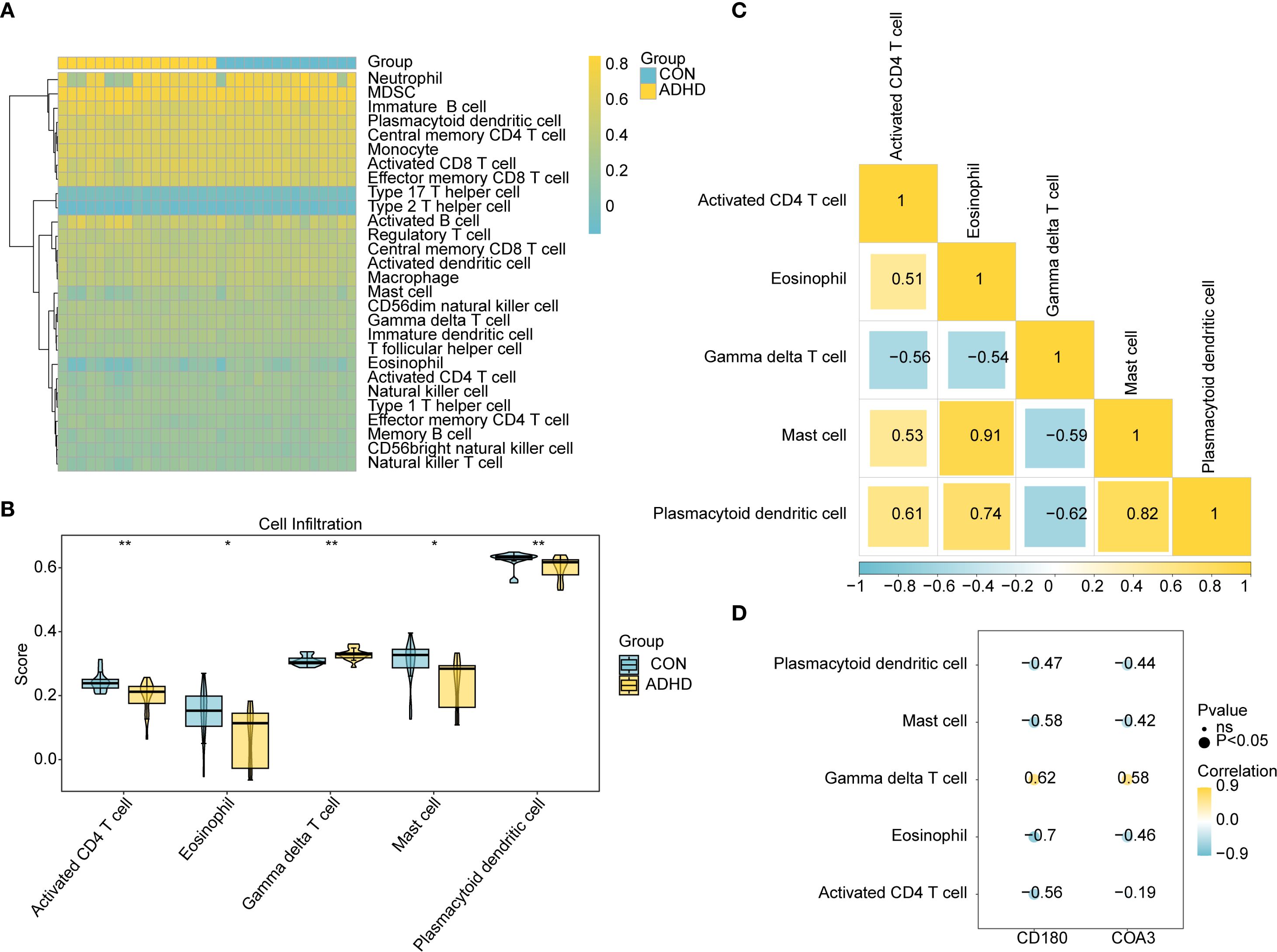 Figure 6. Immune infiltration dysregulation and biomarker associations in ADHD. (A) Immune cell composition across groups. The heatmap depicting the i mmune infiltration status of 28 immune cell types. (B) Differential immune infiltration. Bar plot comparing five immune cell types with significant differences (P < 0.05) between ADHD patients and controls (P < 0.05). (C) Correlation analysis of these differentially infiltrated immune cells demonstrated a strong positive association between mast cells and eosinophils (cor = 0.91, P < 0.05) and a robust negative correlation between γδ T cells and plasmacytoid dendritic cells (cor = -0.62, P < 0.05) (D) Biomarker-immune cell correlations. Scatter plots and coefficients show relationships between CD180/COA3 and immune cells. γδ T cells had the strongest positive correlation with CD180 (cor = 0.62, P < 0.05) and COA3 (cor = 0.58, P < 0.05), whereas eosinophils showed the strongest negative correlation with CD180 (cor = -0.7, P < 0.05) and COA3 (cor = -0.46, P < 0.05).