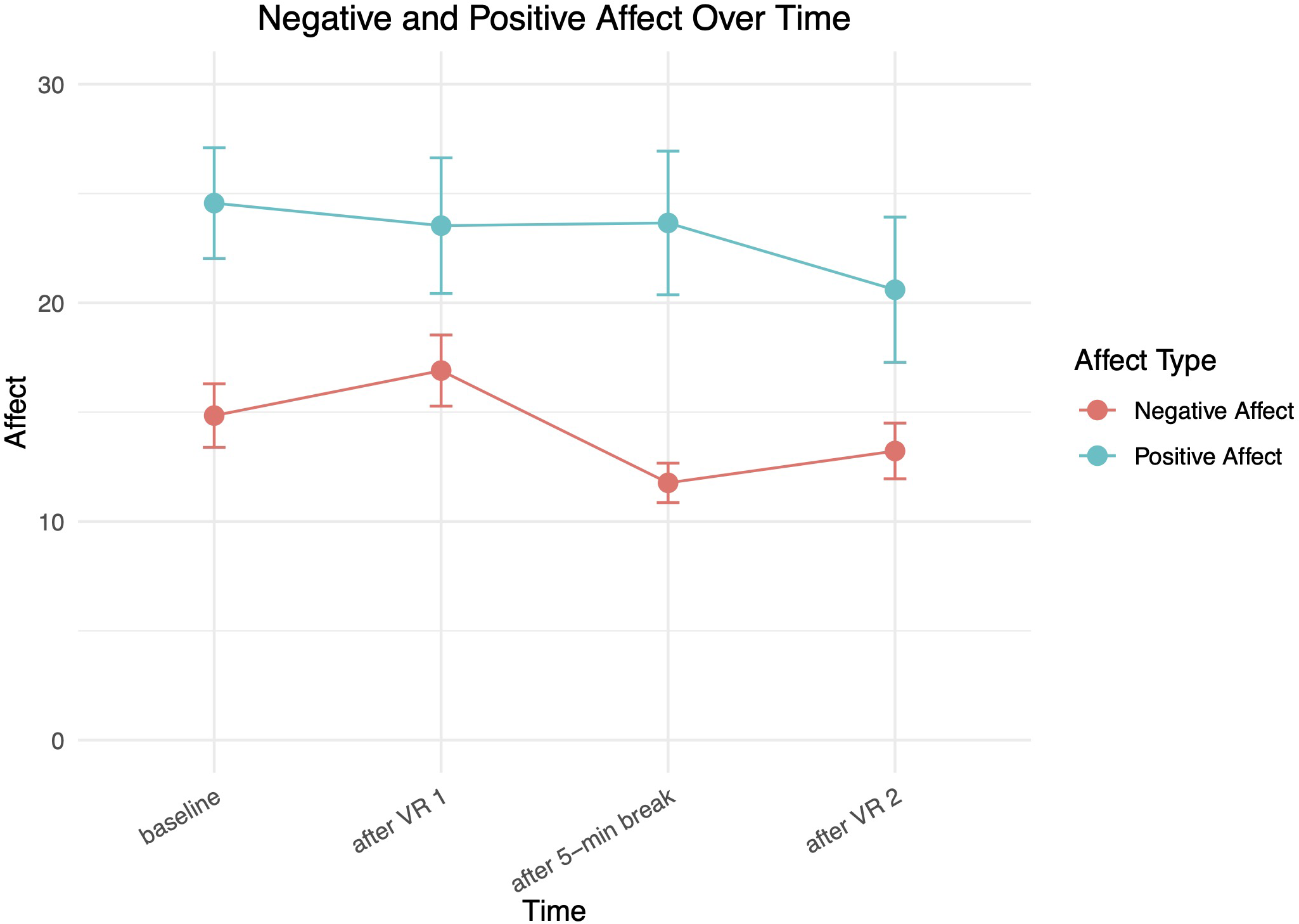 Figure 5 shows average negative and positive affect over time, with positive affect remaining relatively level and then dropping slightly after the 2nd VR exposure. Negative affect increased slightly from baseline to after the 1st VR exposure and decreased as expected during the break, before increasing slightly again during the 2nd VR exposure.