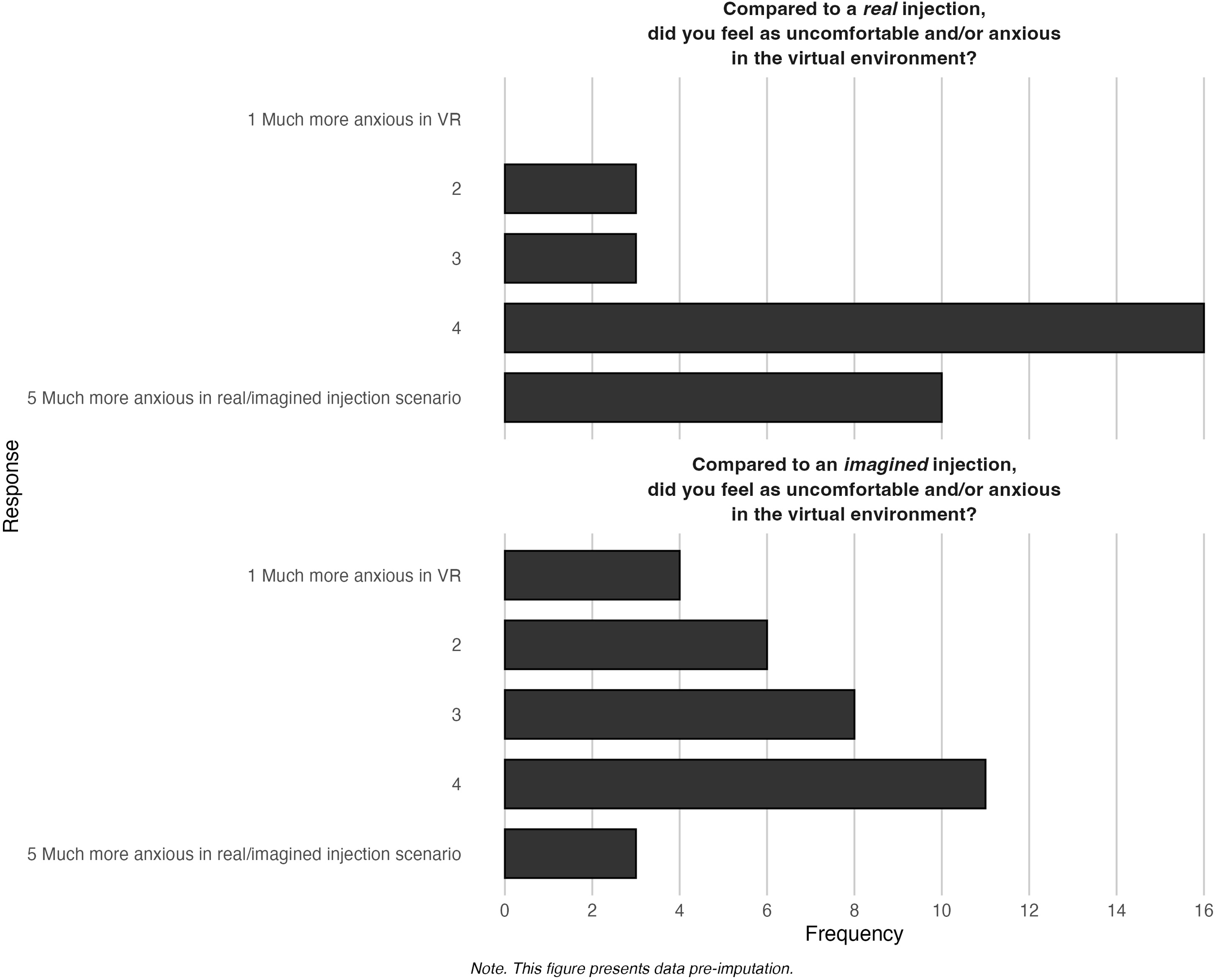 VR presence and plausibility were measured by two questions modeled closely after Slater (28). To measure plausibility, we asked participants to compare the virtual environment to receiving 1) a real injection and 2) an imagined injection. The responses are on a 5-point Likert scale, where 1 is much more anxious in VR and 5 is much more anxious in the real or imagined injection. Responses to each item were analyzed individually. VR sickness was measured using the Simulator Sickness Questionnaire (SSQ) at baseline (α = 0.81) and post-intervention (α = 0.83). The SSQ is on a 4-point Likert scale, ranging from 0 (not at all) to 3 (severe) (27). To assess usability, participants completed the System Usability Scale (SUS), which has a 5-point Likert scale from 1 (strongly disagree) to 5 (strongly agree) and an alpha of 0.88 (29). Scores range from 0 to 100 with a score of ≥ 68 being indicative of above-average user experience (36). It is a validated questionnaire widely used to evaluate user experience with digital systems (37). While the SUS does not provide a direct psychometric assessment of acceptability, we included it as a pragmatic, quantifiable proxy for usability-related components of acceptability. This approach is consistent with recent digital health research (e.g., Bangor et al. (36)Collins-Pisano et al. (38), and Isaacs et al. (39)) and is conceptually aligned with the Theoretical Framework of Acceptability (40), which identifies usability and burden as key constructs.