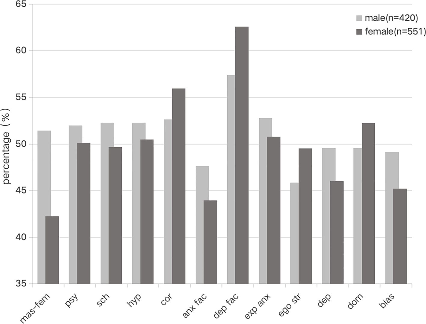 Male respondents scored significantly higher than females on four clinical subscales: masculinity-femininity, psychasthenia, schizophrenia, and hypomania (p < 0.05) (Table 5).