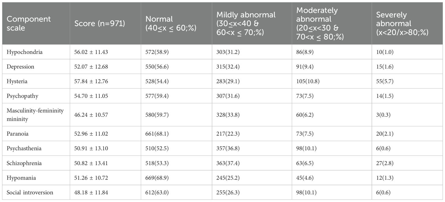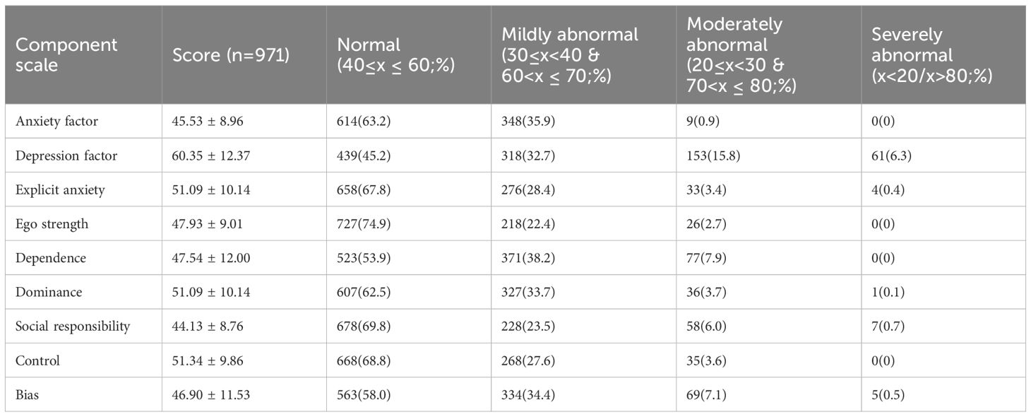 For clinical interpretation, T-scores on each subscale were categorized using established thresholds (18): A T-score of 60 served as the cutoff for abnormality: scores > 60 indicated abnormal functioning, while scores > 70 indicated pathological functioning. Given that extremely high or low T-scores both signal compromised mental status, participants’ overall mental status was stratified into four categories based on subscale T-scores: