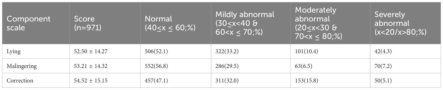 The mean scores of the three validity scales ranged from 52.50 to 54.52, which were all within the normal range; the differences among the participants were still relatively large, with Malingering having the highest normal proportion (56.8%), followed by lying (52.1%) and correction (47.1%) (Table 2).
