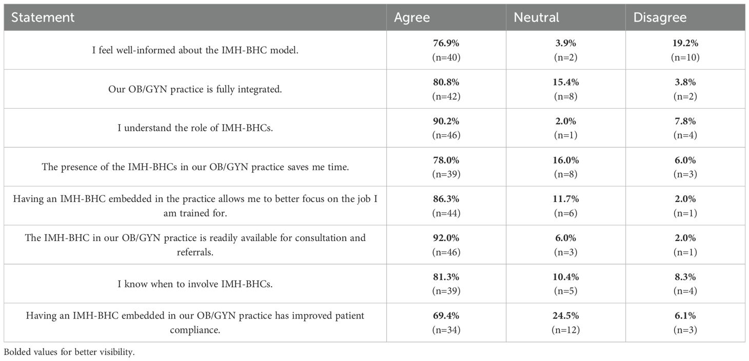 The confidential online survey was emailed to 85 clinic providers or staff, and 52 (61%) providers returned the survey. As the survey distribution was done by the clinic manager, information about reasons for declining and characteristics for self-selection is missing. The survey, tapping into awareness of and satisfaction with the integration model, contained 13 questions; 4 questions asked information about professional role and tenure at the clinic, credentials, and age; 8 questions asked about knowledge and satisfaction with the integrated IMH model (Table 1); and the last question asked about willingness to participate in an in-depth qualitative interview on the subject. The survey instrument was developed collaboratively by the research team with input from the clinic manager and IMH-BHCs. Respondents rated their knowledge and satisfaction with the integrated IMH model on a 7-point Likert scale (strongly disagree, somewhat disagree, disagree, neutral, somewhat agree, agree, and strongly agree). To facilitate analysis and consistent with recommendations from existing literature (26, 27), we collapsed responses into three categories: agree, neutral, and disagree. This decision was made due to observed low response frequencies in some categories (somewhat and strongly) and to improve interpretability and statistical power. Participation in the survey was not reimbursed.
