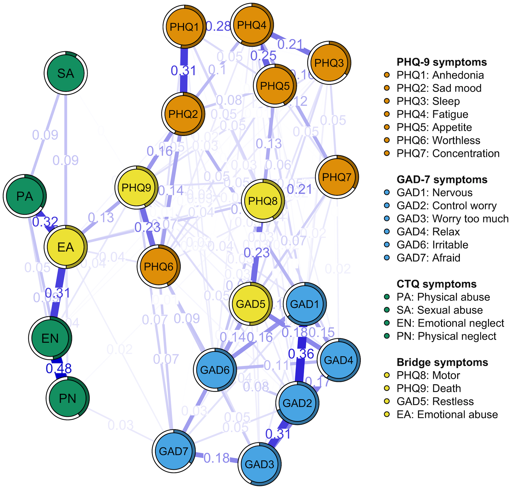 Based on the prior considerations and initial observations, this research is designed to explore three main questions. First, it explores the overall network structure involving symptoms of depression, anxiety, and childhood abuse among clinically depressed adolescents with suicidal ideation. Second, it highlights the specific symptoms occupying central positions within this comorbid symptom network, thereby elucidating potential targets for intervention. Lastly, it examines which symptoms function as critical bridge nodes that interconnect different symptom clusters (e.g., depression, anxiety, and childhood abuse). These bridge nodes may play a role in the spread of psychopathology or highlight the direct impact of environmental factors.