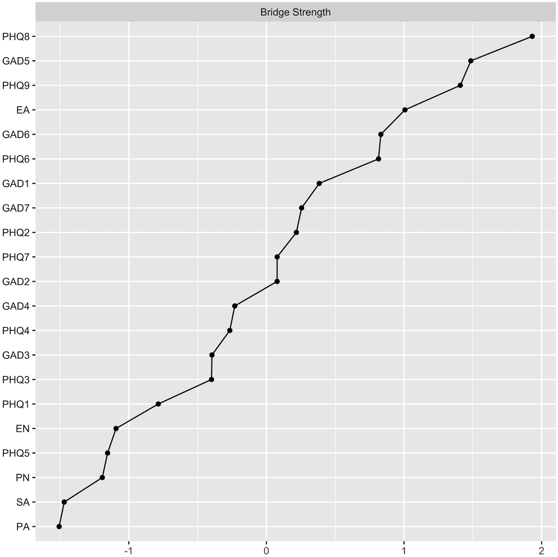 To gain a deeper understanding of the relationships between different symptom communities, the bridge strength of each node was calculated, resulting in the bridge network illustrated in Figure 1. According to the bridge strength analysis shown in Figure 3, the nodes PHQ8, PHQ9, GAD5, and EA exhibit higher bridge strength compared to most other nodes. This signifies that these four nodes serve as critical bridging symptoms, linking various symptom communities within the network. Table 2 presents the raw values for the strength of all symptoms and their respective bridge strengths. We estimated networks for the Han and urban subgroups, and their network structurekey, central symptoms and bridge symptoms were largely consistent with the overall sample (Supplementary Figures 5, 6).