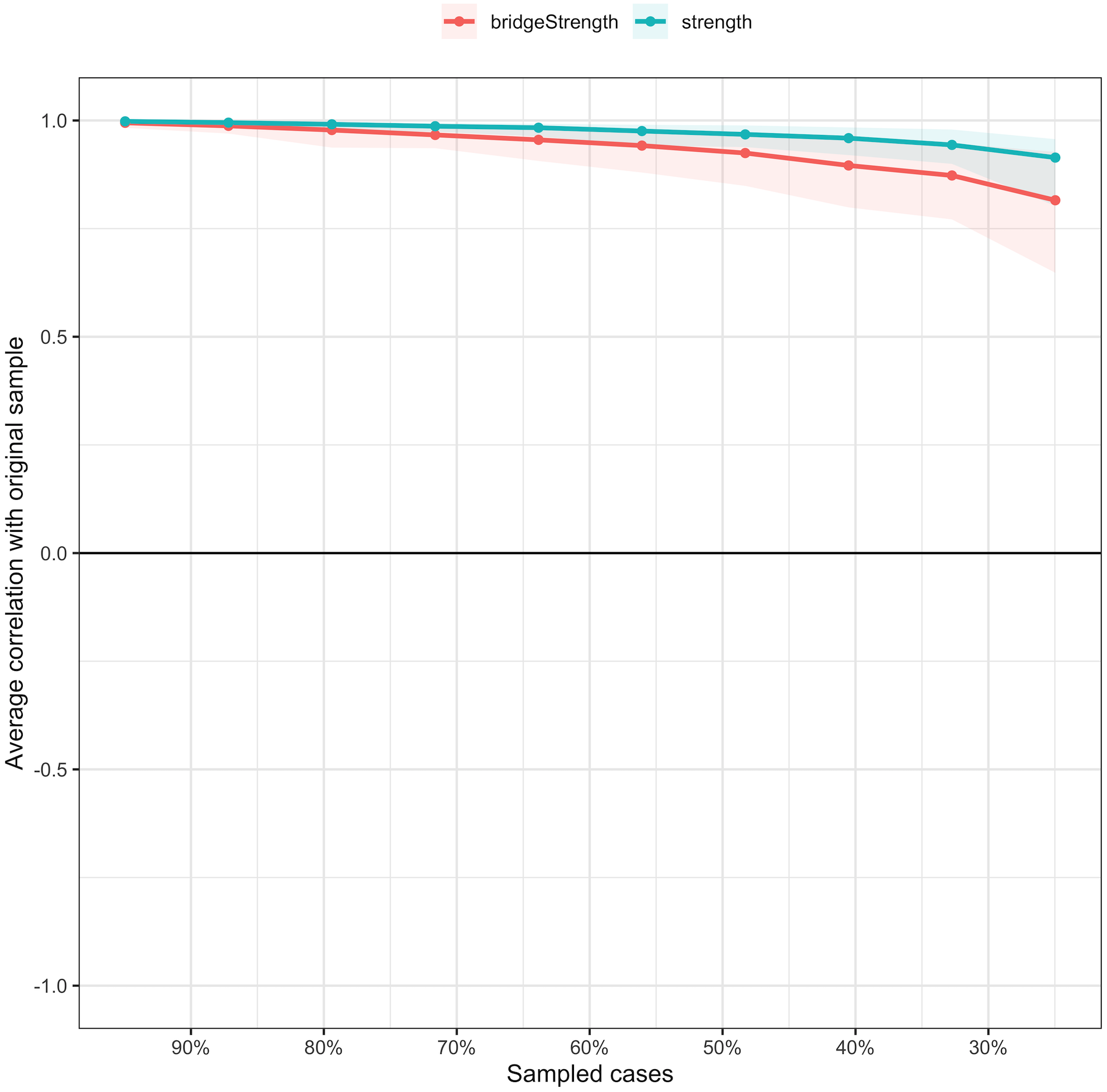 Given the influence of sampling variability on the estimation of network models, we employed the bootstrap method to assess the accuracy and stability of both edge weights and centrality measures. This was accomplished using the bootnet package in R. To evaluate the accuracy of the edge weights, we calculated the 95% confidence intervals (CI) for the edge-weight bootstrap. For assessing the stability of centrality measures, we utilized the centrality stability coefficient (CS coefficient). This coefficient serves as a reference index for determining the robustness of the centrality measures against sampling variability.